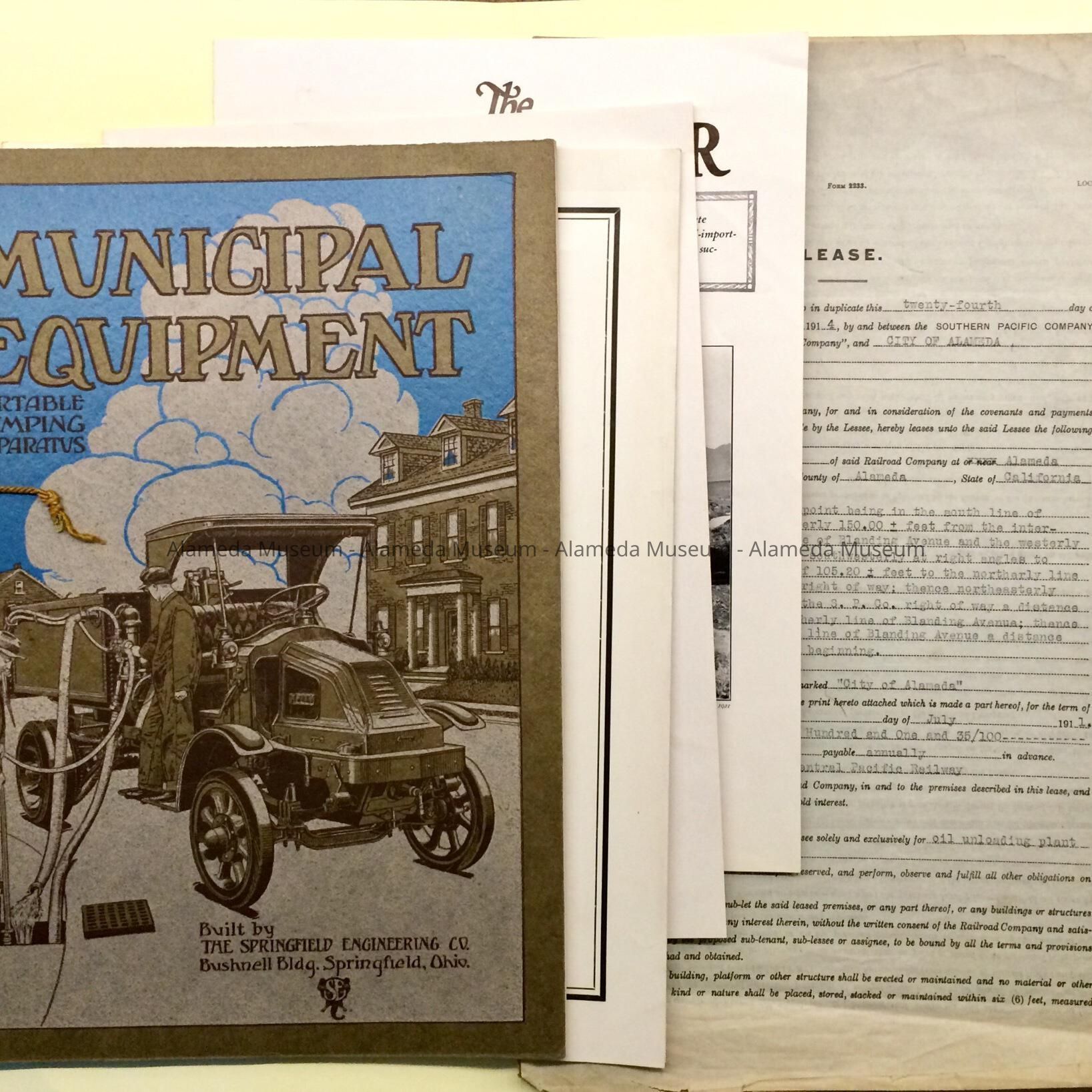 Documents found in the attic of City Hall. This folder holds sales brochures for sewer cleaning/street sprinkling trucks (undated), and asphalt (‘The Roadrunner’ One and Two, c. 1922); a 1914 lease form between the City and the Southern Pacific Company, regarding land between Blanding and Pearl for an oil unloading plant; and 1920 comparison from City Engineer C. E. Hickok to City Manager C. E. Hewes, showing increase in expenses, including wages.