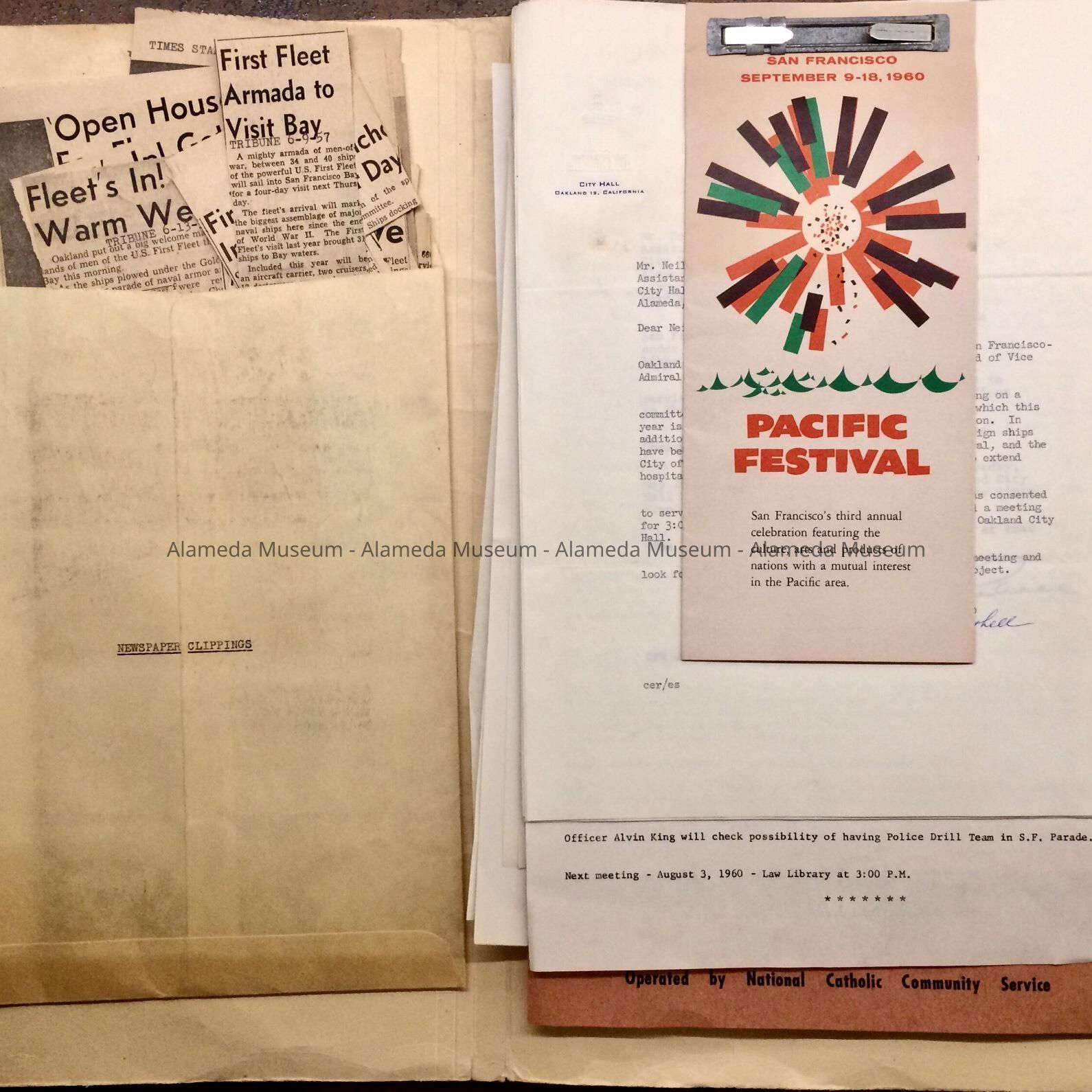 Correspondence, mostly to and from Alameda Mayor William McCall, and envelope with clippings, regarding the visits of the ‘First Fleet’ to the San Francisco Bay Area, spanning 1956-1960. Includes program for September 1960 San Francisco ‘Pacific Festival’, San Francisco’s third annual celebration.