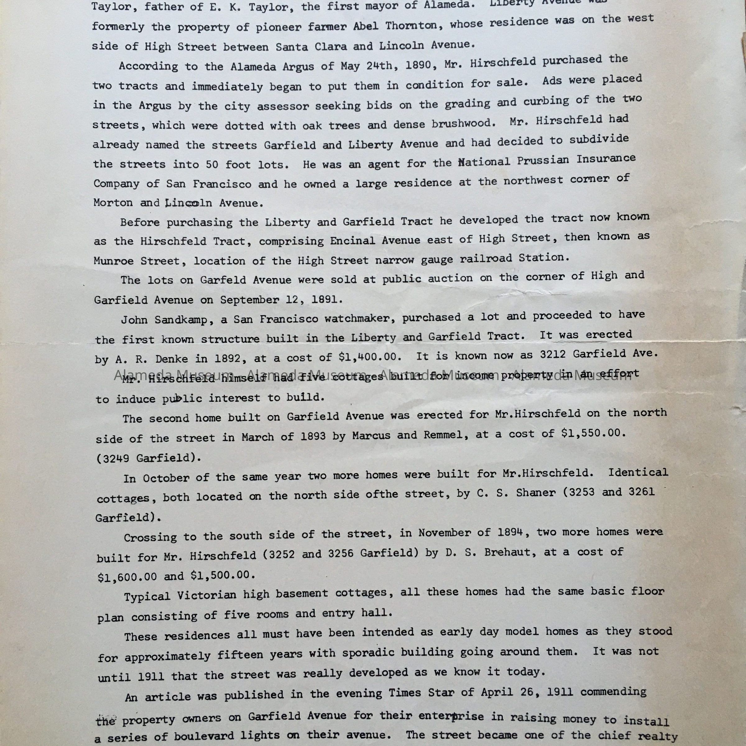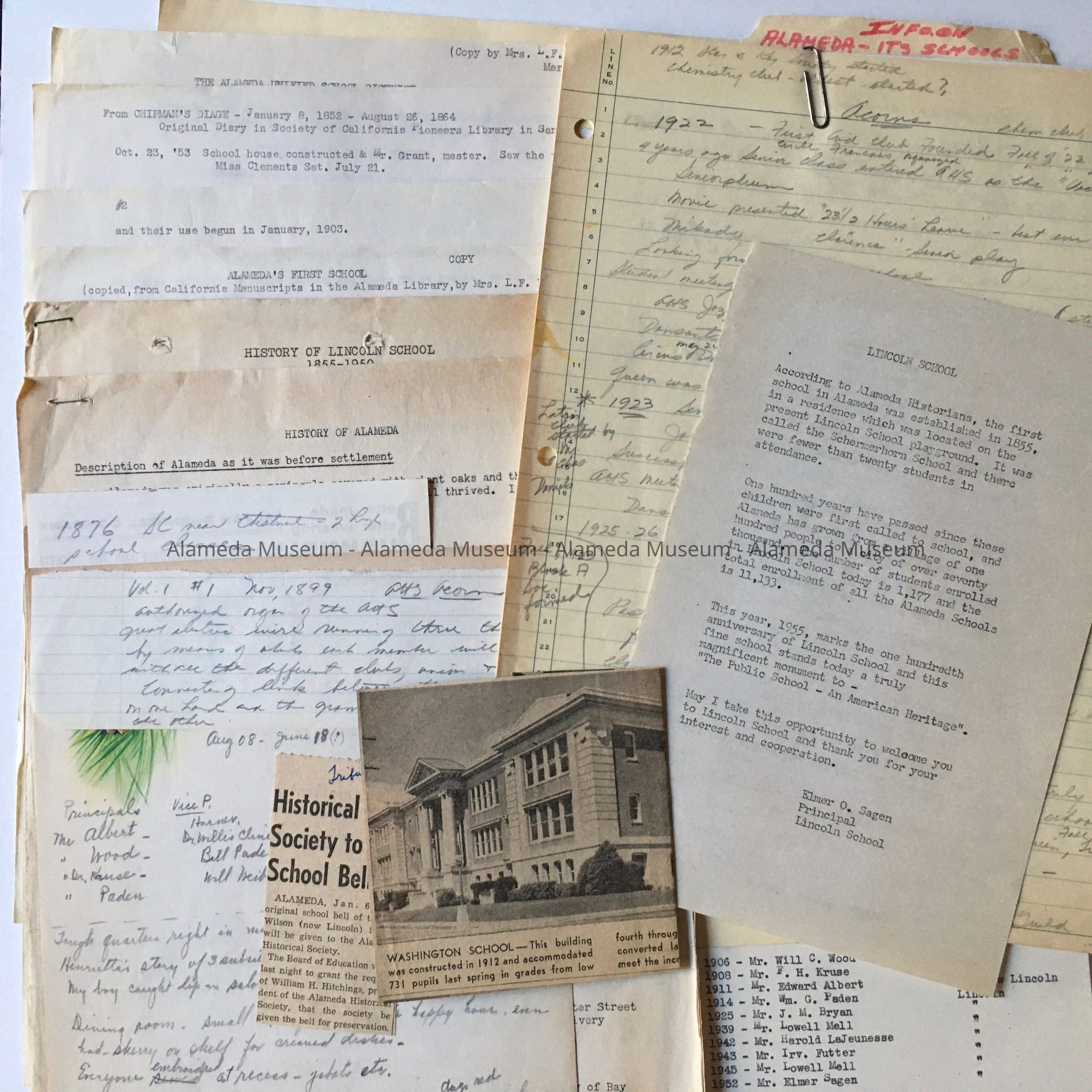History of Object: A folder of histories, mostly about Alameda schools, plus one about the Garfield and Liberty Tract, collected by Mrs. Randall, nee Fritzi Bush. (No information on the Bureau nor San Francisco).