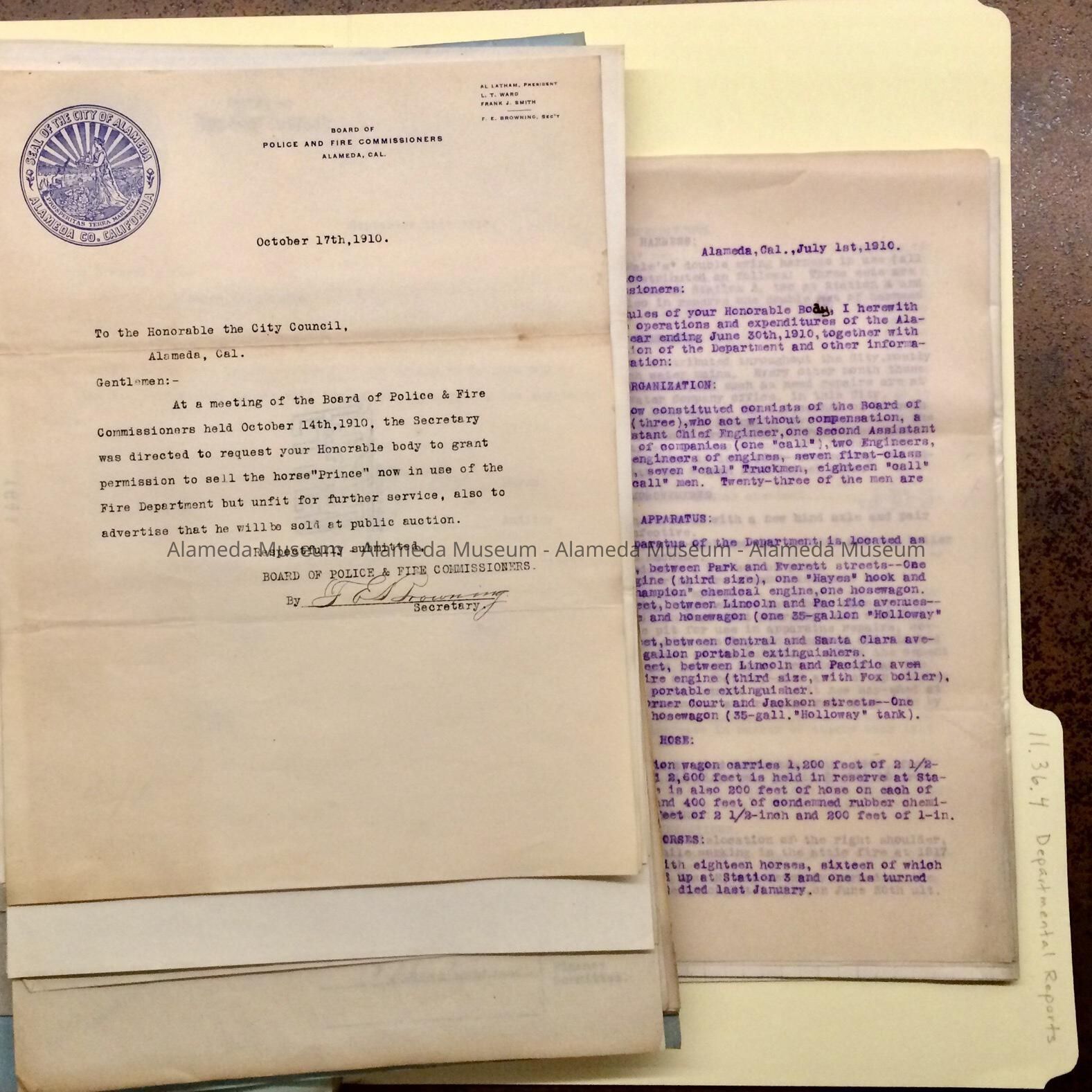 Miscellaneous documents from / to the council and/or mayor of Alameda, started during tenure of City Clerk F.E. Browning (with later additions), found in the attic of City Hall during remodeling in the 1990s. Documents in this folder relate to: Assessment records (1605), various department reports, street repairs, budgets - including one for a seawall, petitions for leave of absence; selling of Fire Department horses and buying of others; and protests against a Milk ordinance requiring delivery in single containers, while such containers were not available (1649).