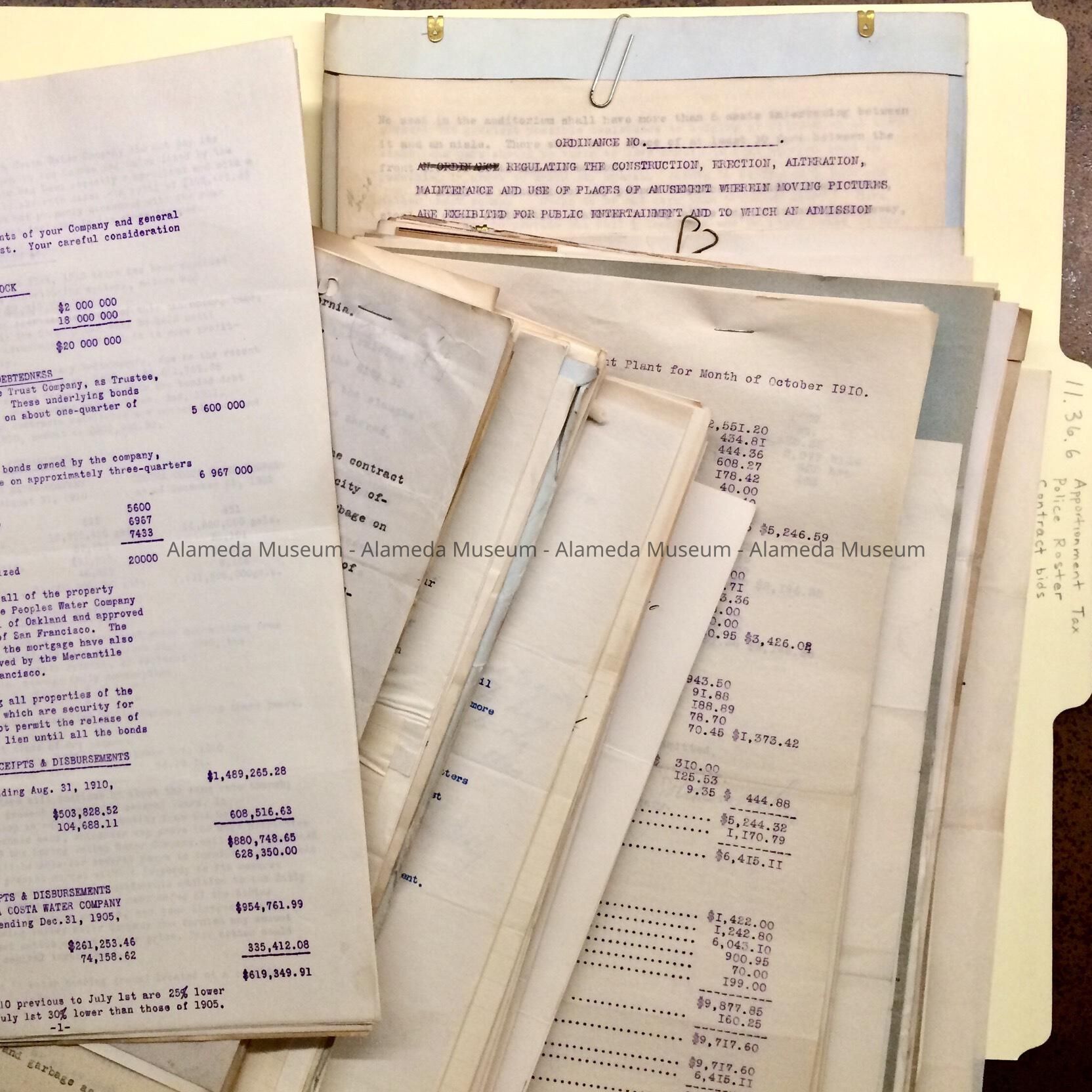 Miscellaneous documents from / to the council and/or mayor of Alameda, started during tenure of City Clerk F.E. Browning (with later additions), found in the attic of City Hall during remodeling in the 1990s. Documents in this folder especially of interest relate to: Water Bond Issues (1651), Garbage (1657); Auto Bids for the Street Department (1673); Item 1656 - request for regulating speed of traffic, carrying of lights from sunset to sunrise, and warning signs indicating speed; Item 1658 - purchase of a Burroughs Adding machine by/for F.J. Croll - Items 1670 and 1671 - Oath of Office Forms; Item 1675-22: Electric Light Company asks City to turn off lights to better see Halley’s Comet; Item 1676-13 - Derby Lodge, Sons of St. George want to hold a memorial service for King Edward VII; Item 1677- petitions for free business licenses for blind/crippled/poor citizens; Item 1665 - bids and contract for sewer work on Fernside Blvd; Item 1680 - Spreadsheet for Apportionment of taxes; Item 1684 ½ - Edward K. Taylor Attorney letterhead; Item 1685, ordnance re moving pictures; Item 1687 - Roster of police officers and date of hiring, breakdown of crimes, nativity and license fees collected.