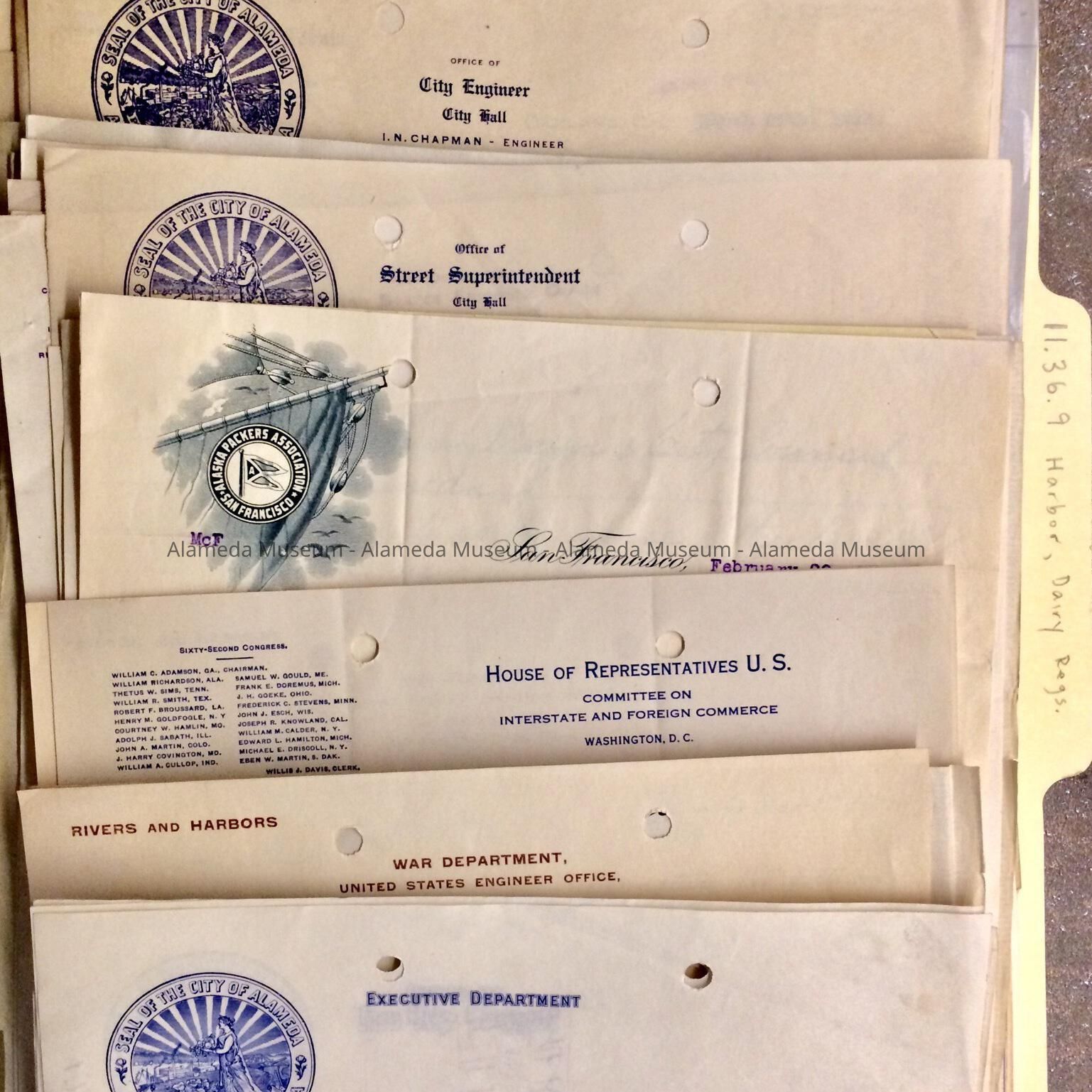 Miscellaneous documents from / to the council and/or mayor of Alameda, started during tenure of City Clerk F.E. Browning (with later additions), found in the attic of City Hall during remodeling in the 1990s. Documents in this folder relate to: semi-annual reports, salaries, and budget estimates from various city departments; appointments, oaths of office, applications, and resignations of personnel, including I.N. Chapman, City Engineer, death of City Attorney William Simpson (1911); leaving of City Clerk F. E. Browning (1913), complaints and resignation of Poundmaster John May who spent more time fishing and shooting than attending to the pound; Item 1703 - changes to the Oakland Harbor affecting Alameda, including a letter from the Alaska Packers Association, S.F.; Item 1720 - installing of Lamp Posts (1911) by the Municipal Electric Light Plant and Bureau of Electricity; Item 1727 - regulations governing dairies; Item 1740 includes letterhead from Hally & Co., Real Estate and Insurance, 2315 Santa Clara; Item 1717-2 includes a list of addresses of council members (1911); Item 1739 - Letter from Surf Beach requesting reduction in license fee of running a merry-go-round, stating they can only run the business for 3 months of the year.