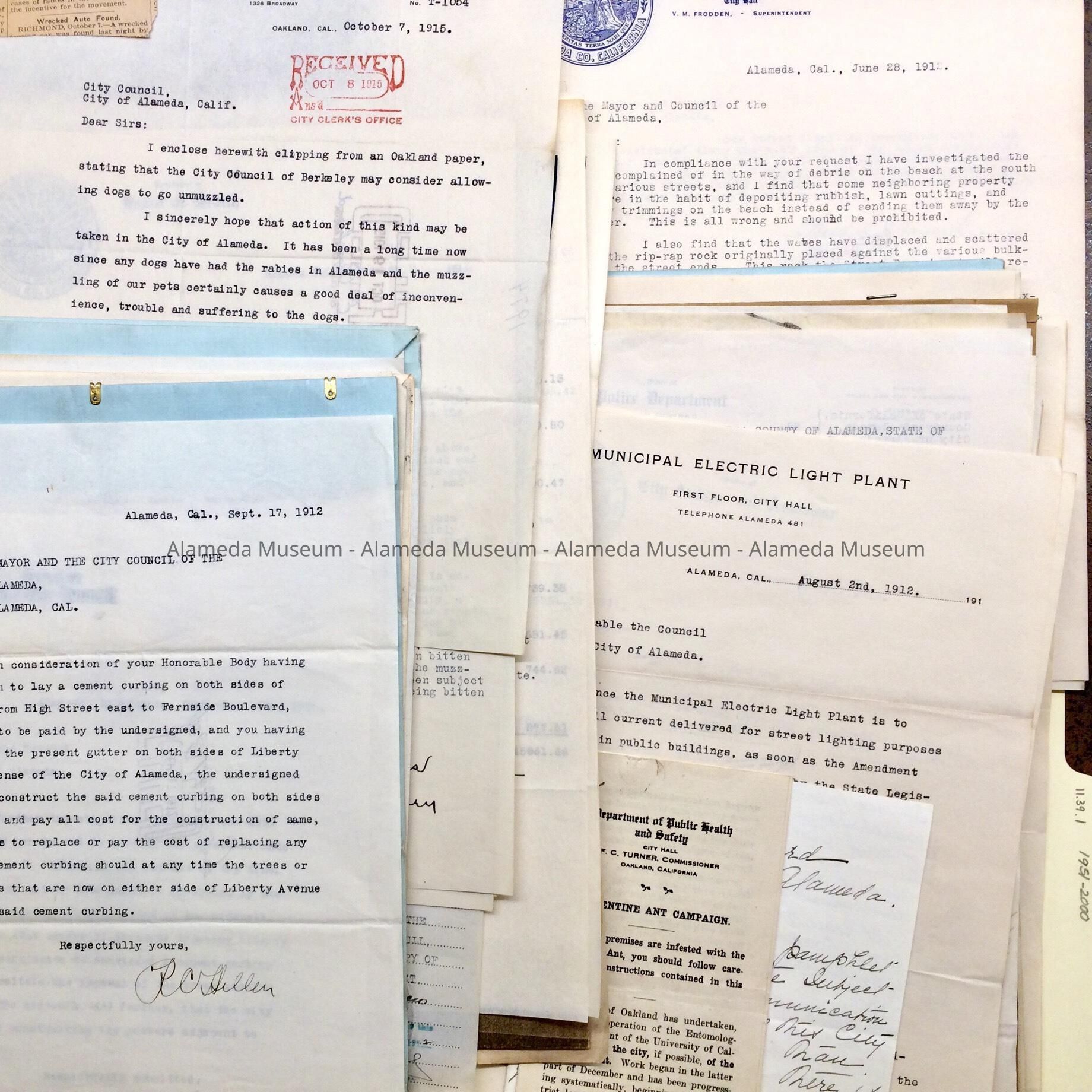 Miscellaneous documents from / to the council and/or mayor of Alameda, started during tenure of City Clerk F.E. Browning (with later additions), found in the attic of City Hall during remodeling in the 1990s. Documents in this folder include: Semi-annual or annual reports from various City Departments for 1912, maintenance work on streets; Rabies epidemic control by muzzling and quarantining dogs (Item 1974); campaign to eliminate the Argentinian ant (Item 1958); Saloon of Edw. C. Mills, at 2170 Encinal Ave, selling liquor to women, and without paying for a license (Item 1966); a seawall being constructed along Bay Island Avenue between Park Street and Park Avenue (Item 1972); complaints, about rubbish and oil on the beaches, about dangerous train crossings.