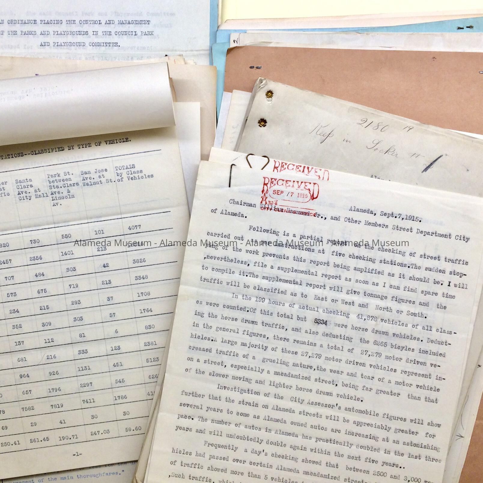Miscellaneous documents from / to the council and/or mayor of Alameda, started in 1913 with later additions (and one from 1912), found in the attic of City Hall during remodeling in the 1990s. Documents in this folder include: Reports from various departments for 1913; personnel issues; much ado about street improvements, including a survey of traffic (Item 2180). Item 2152- Petitions for and against rock-shooting near the beaches, includes letters on stationery from the Encinal Yacht club and Bay Shore Club; issues with liquor licensing, and youths being attracted to hang around parks; Item 2181- ordinance proposal to block protests & picketing; Item 2182 - Letterhead of 5th Infantry - petition for a boxing exhibition; Item 2183 - Audit of Electric Light Plant for 1911-1912
