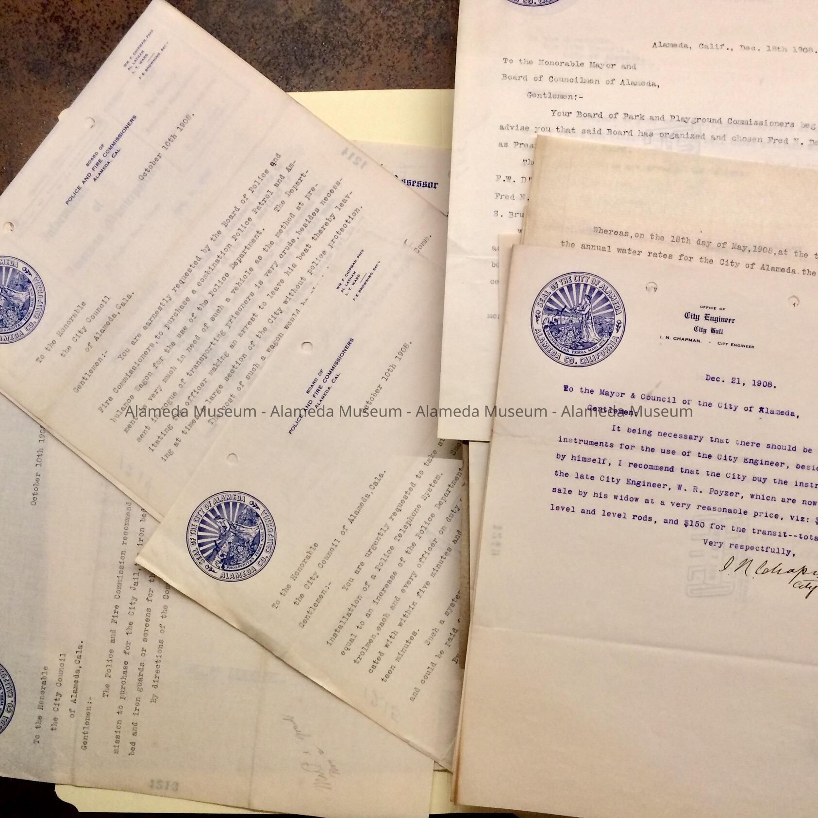 History of Objects: Miscellaneous City services documents, including Item 1203- Abstract of Title for land purchase for Wilson school, and correspondence relating to ensuring nothing would impede purchase, documents regarding a trial vs J. E. Oltmann, to acquire land which was owned by fictitious names; Item 1216 - Documents relating to Firehouse repair; Item 1240 - Electric Light Plant wants to give free light to Company G, 5th Infantry, and the California Girls Training Home