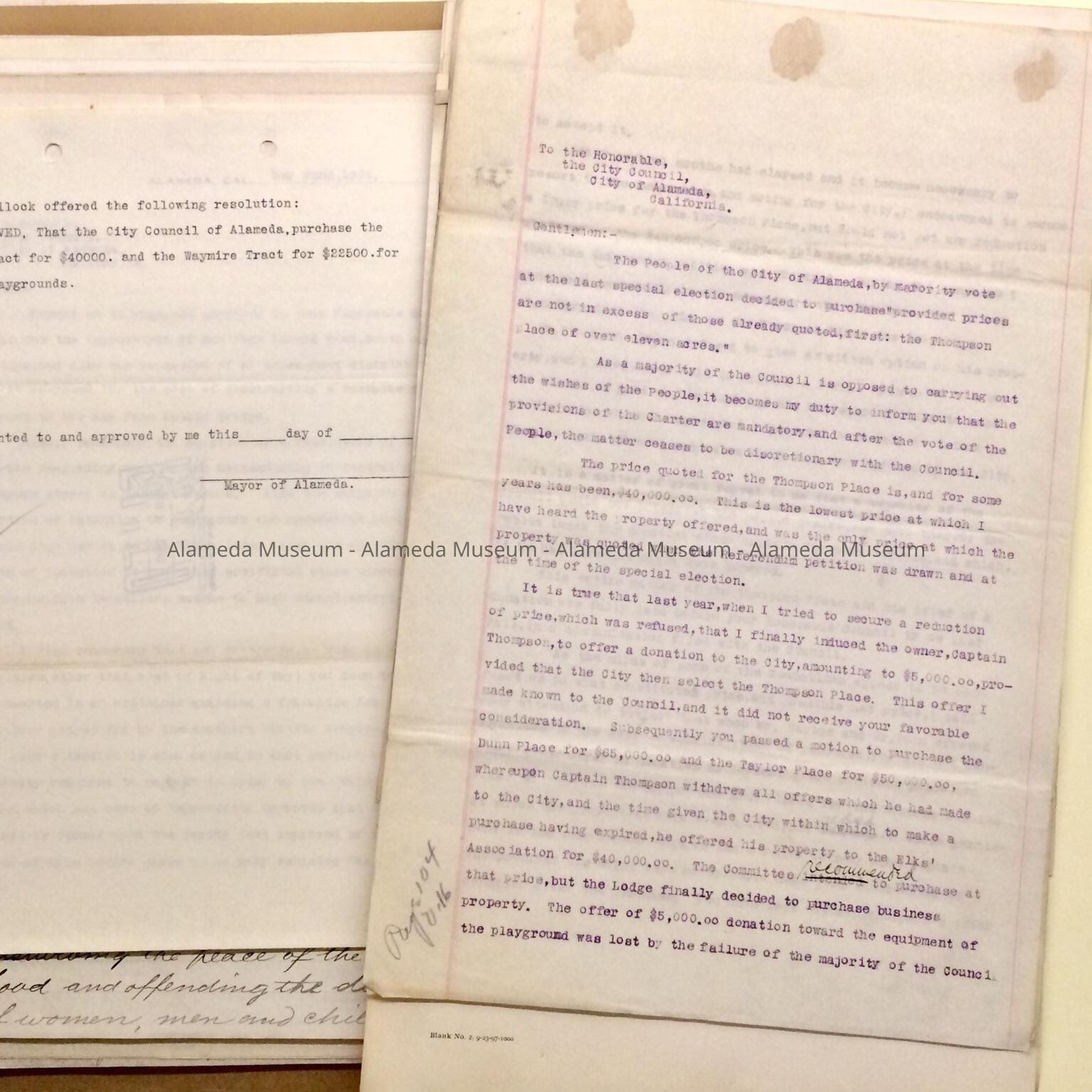 History of Object: Misc. City documents, including Item #1076 - Accounting of operating costs for grammar & primary schools and suggestion to levy tax to generate sufficient funds; 1076 #2, is a collection of estimated expenses for several city departments from janitorial to Fire Dept; Item # 1100 relates to special election to purchase park land, see 11.34.5.; E.K. Taylor explains the apparent difference in purchase price of Thompson Place, including a $5000 "donation" to the city.