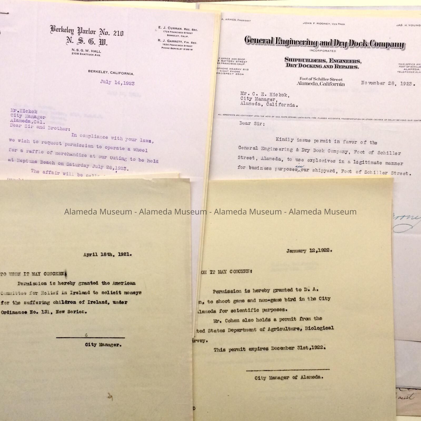Documents found in the attic of City Hall. This folder holds correspondence involving City Manager Hickok, specifically: