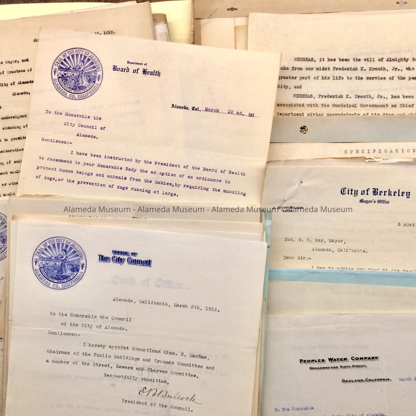 Miscellaneous documents from / to the council and/or mayor of Alameda, started during tenure of City Clerk F.E. Browning (with later additions), found in the attic of City Hall during remodeling in the 1990s. Documents in this folder relate to: budget estimates by the various departments for fiscal year ending in 1913; sewer and street contracts and work; General Fund changes and bond measures; Contract given to Argus Publishing Co. for publishing official notices, previously held by the Evening Times-Star (Item 1902); Street improvements, especially the widening of Encinal Avenue (Item 1907); Charles W. MacRae replacing Peter Christensen upon the latter’s death; installing of extra lamp posts (Item 1916); Letter from City of Berkeley announcing resolution to form a shared East Bay Water District (1912, Item 1935); Actions taken in memory of Frederick K. Krauth, Jr., Fire Chief (Item 1945); bids for sinking of a tank in Lincoln Park, including by locals Thomas Tasker, and Charles W. Macrae (letterhead states 2315 Encinal, res. 1091 Park Ave; bid includes drawings).