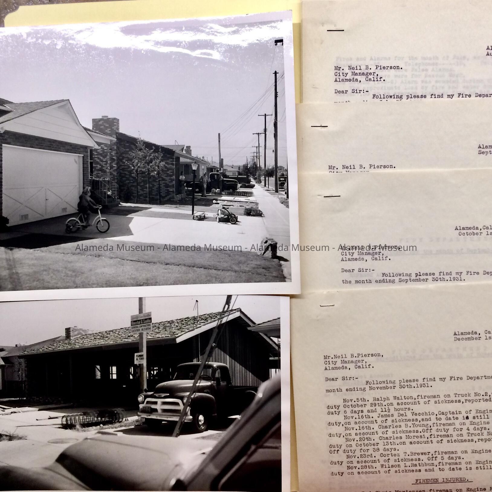 Folder with monthly Fire Department reports, May 1931-December 1931, addressed to Neil B. Pierson, including leaves of absence, fireman injured or died, and use of the inhalator - to treat ‘immersion’, stroke, heart attack. Also includes 2 photos, by Aspinall, taken by request of Asst. City Manager, July 28, 1959, of 3270 Washington St. under construction. Contractor’s sign appears to state: Almestad & Saakko, plumber Al Ferrero. No other reason given for the photos.