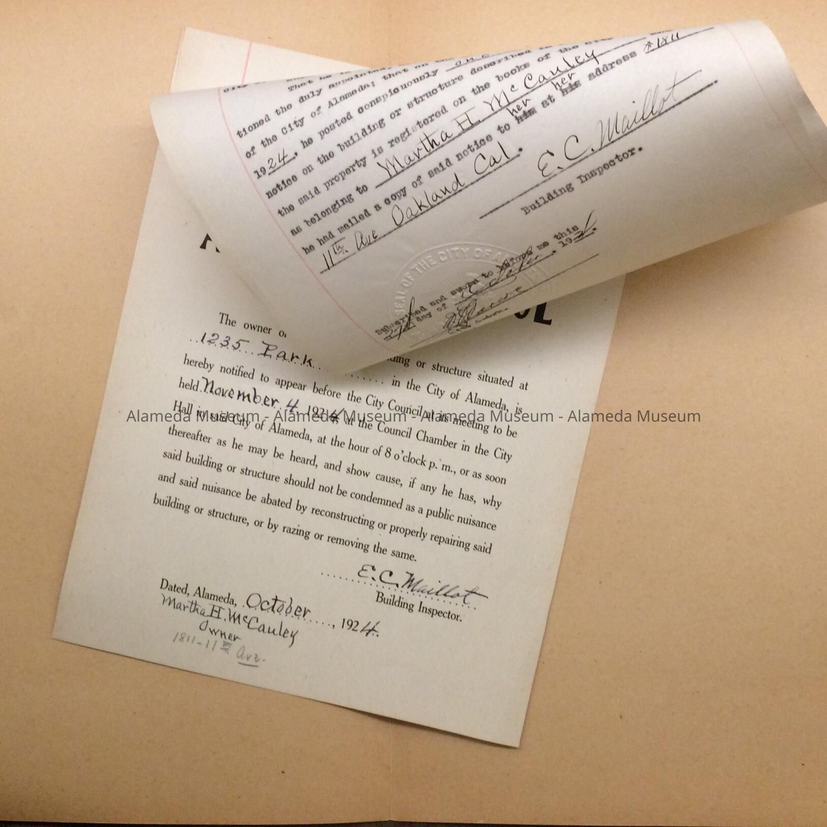 History of Object: File folder with documents and notice of nuisance of 1235 Park St., owned by Martha H. McCauley, from 1811 11th Ave Oakland.