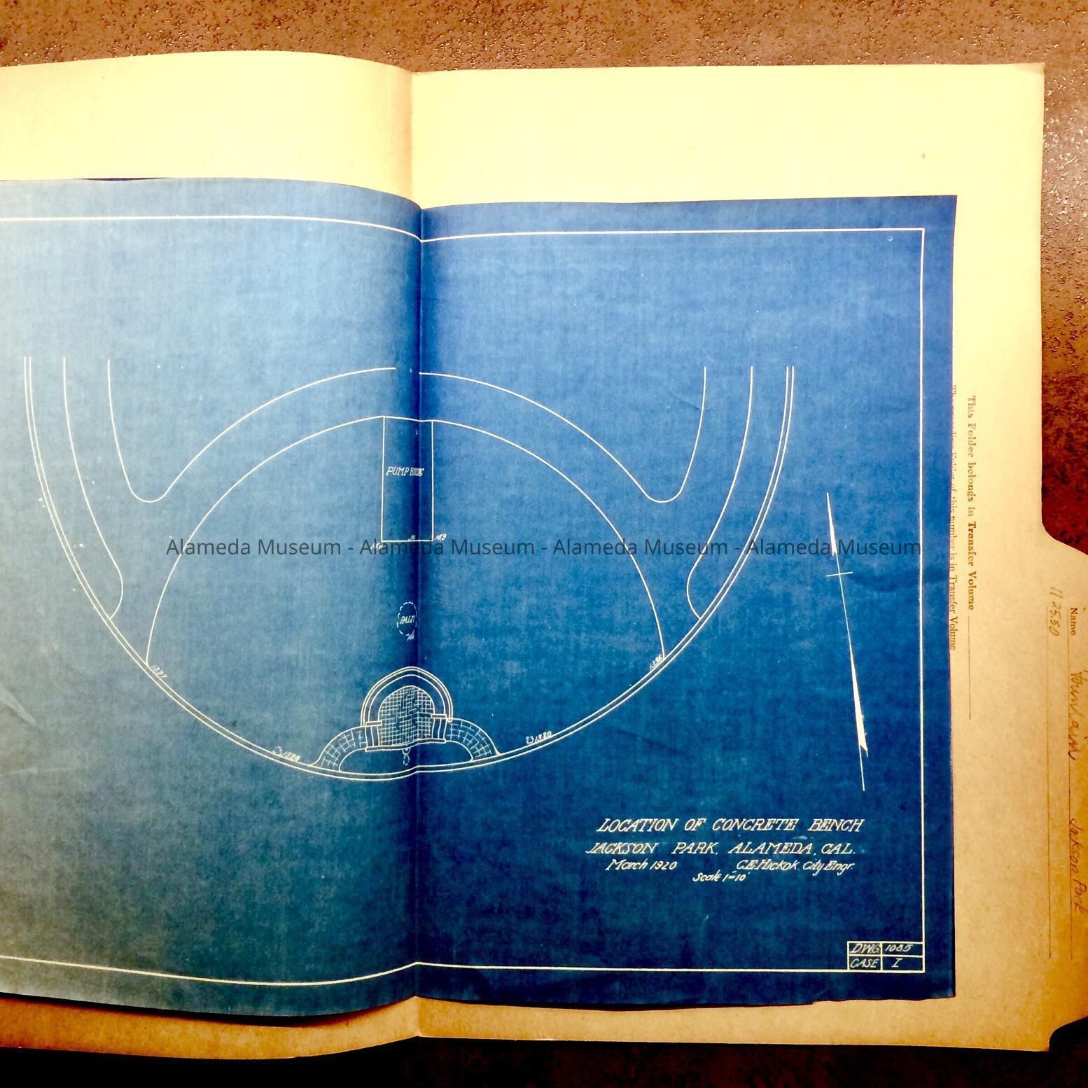A FILE FOLDER CONTAINING A BLUEPRINT DEPICTING THE CONCRETE BENCH AT JACKSON PARK IN ALAMEDA.