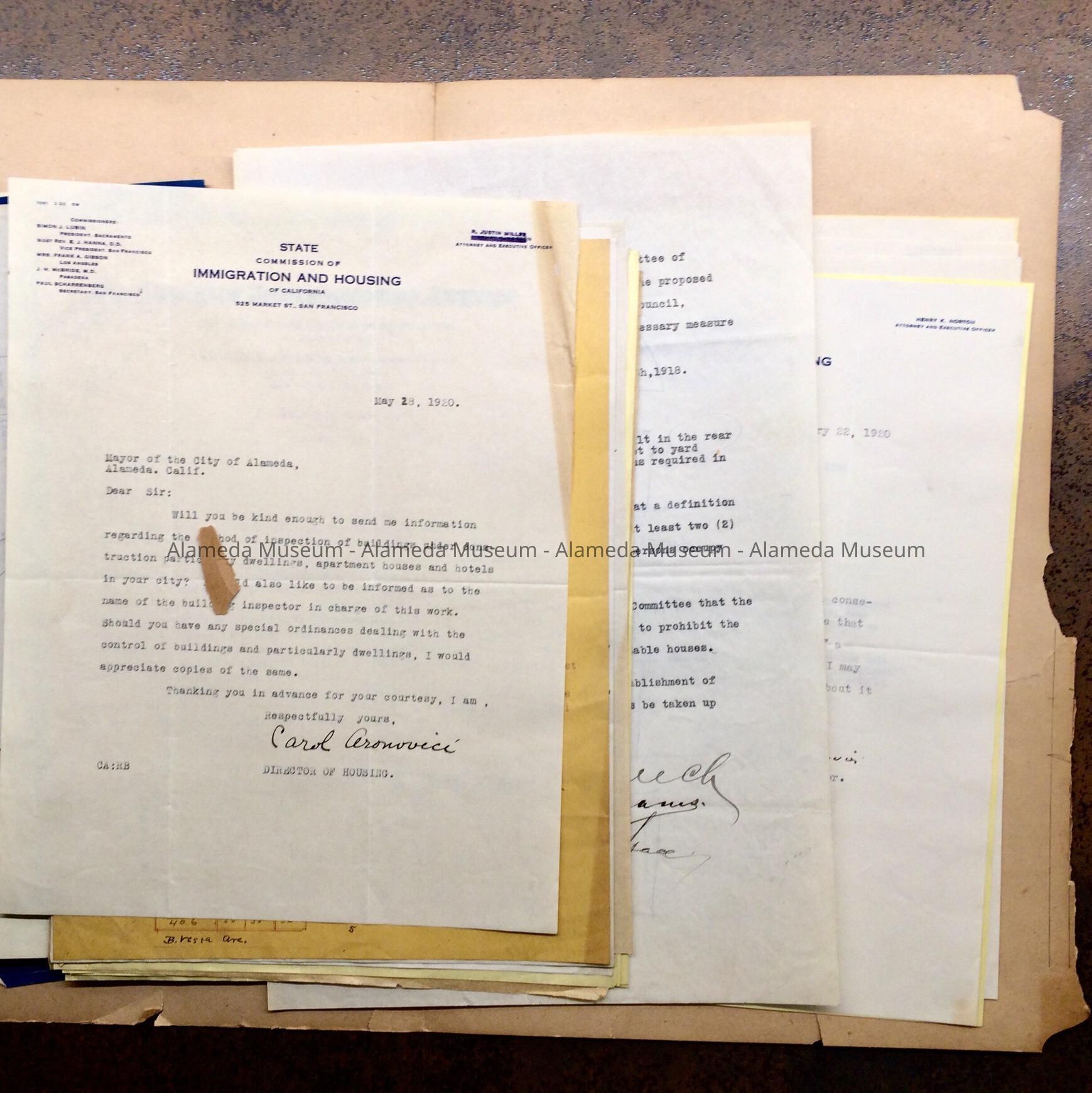 A FILE FOLDER CONTAINING COPIES OF CORRESPONDENCE RELATING TO IMMIGRATION AND HOUSING FROM THE STATE COMMISSION OF IMMIGRATION AND HOUSING IN THE STATE OF CALIFORNIA.