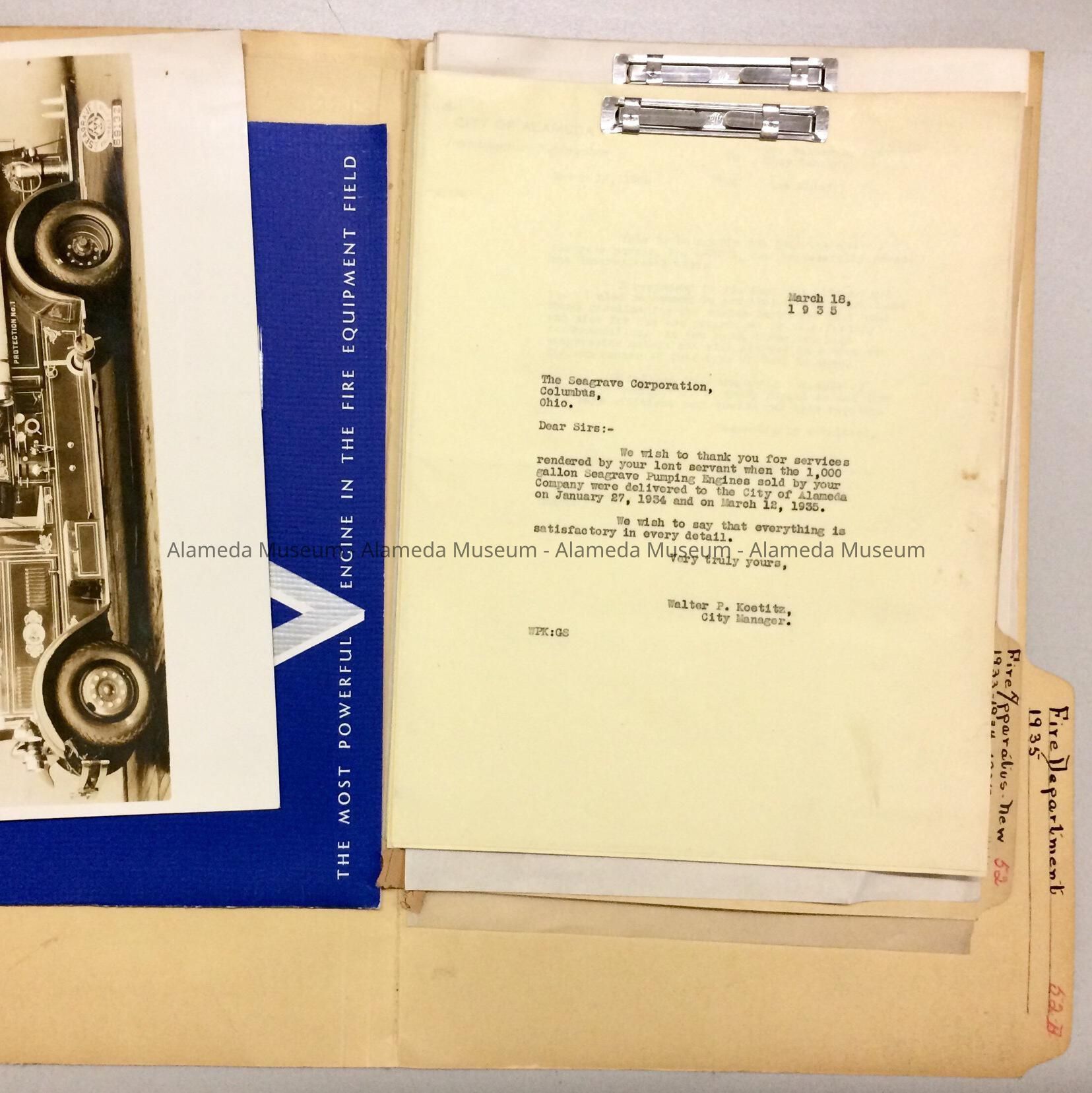 A FOLDER CONTAINING CORRESPONDENCE, PRODUCT BROCHURE, AND PHOTOGRAPHS OF THE SEAGRAVE FIRE TRUCK. ALSO INCLUDED IS A PAYMENT SCHEDULE FOR PURCHASES. INFORMATION PERTAINING TO THE OPERATION OF FIRE VEHICLES USED BY THE ALAMEDA FIRE DEPARTMENT DURING THAT PERIOD IS ALSO INCLUDED.