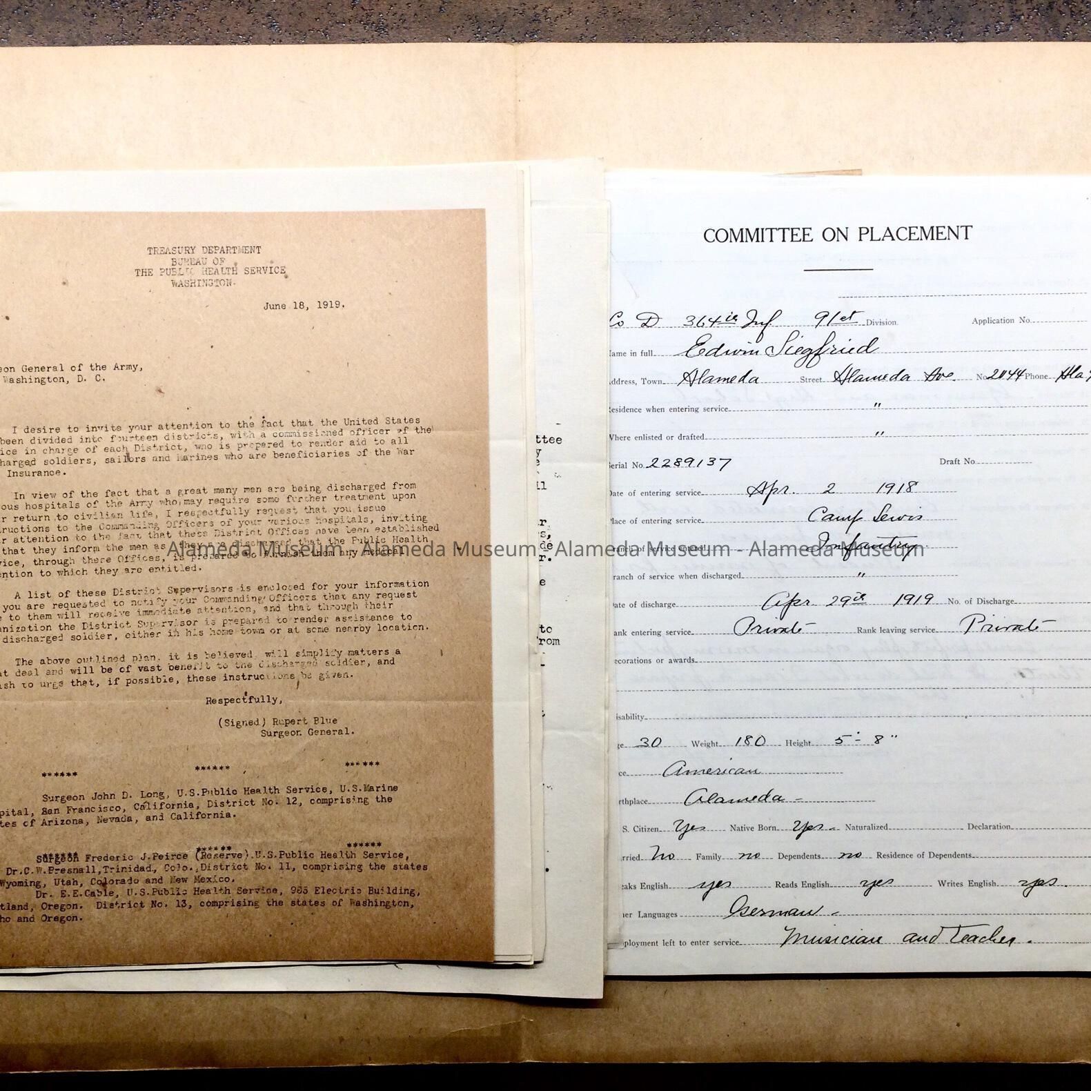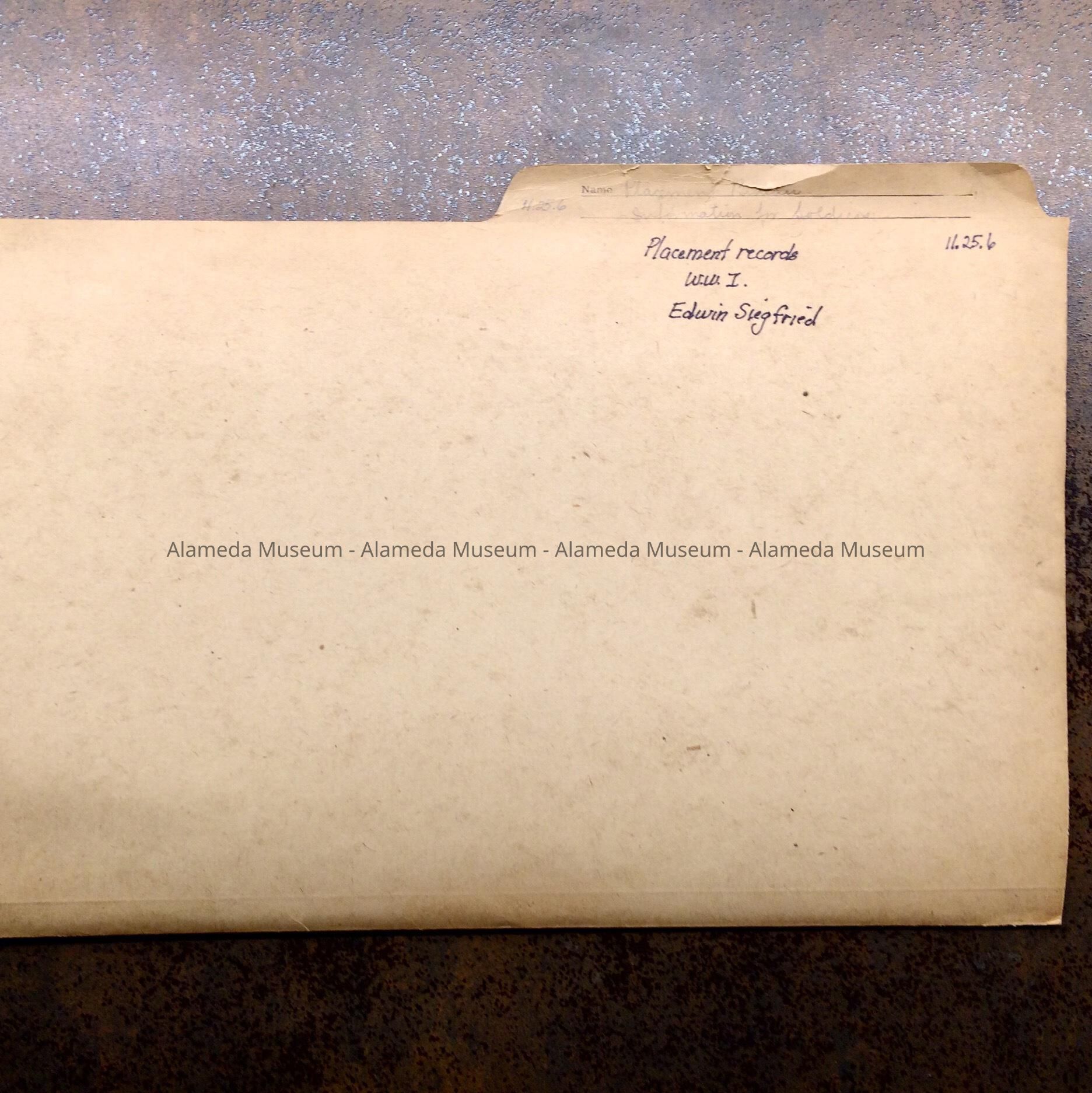 HISTORY OF OBJECT: A FILE FOLDER CONTAINING COPIES OF CORRESPONDENCE, ETC. INFORMATION REGARDING ALAMEDA RESIDENTS WHO SERVED IN WW-I. ED. SIGFRIED, ARTIST, WAS AMONG THOSE MENTIONED.