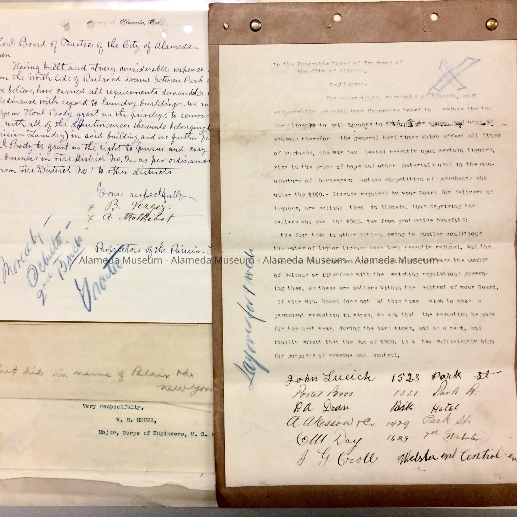 History of Object: Folder found in the attic of City Hall, containing petitions: undated: petition to reduce liquor license fee, petitioners include J. G. Croll, Postel Bros. and Drau, Park Hotel; 189[missing last digit], Petition to move the Parisian Laundry; 1894, bid for bonds by Mr. Hellman, to E.K. Taylor, City Attorney, check to be carried by Mr. Macdonald; 1898, board of education requests to issue bonds for maintenance and heating at Encinal and Haight schools; 1898, notification by W.H. Heuer, Corps of Engineers, War Dept. of a hearing regarding a drawbridge at Webster Street; 1898 written on back, petition for light at Everett Street; 1898, petition for refund of license fee for running a wagon, which was no longer possible due to a new regulation.