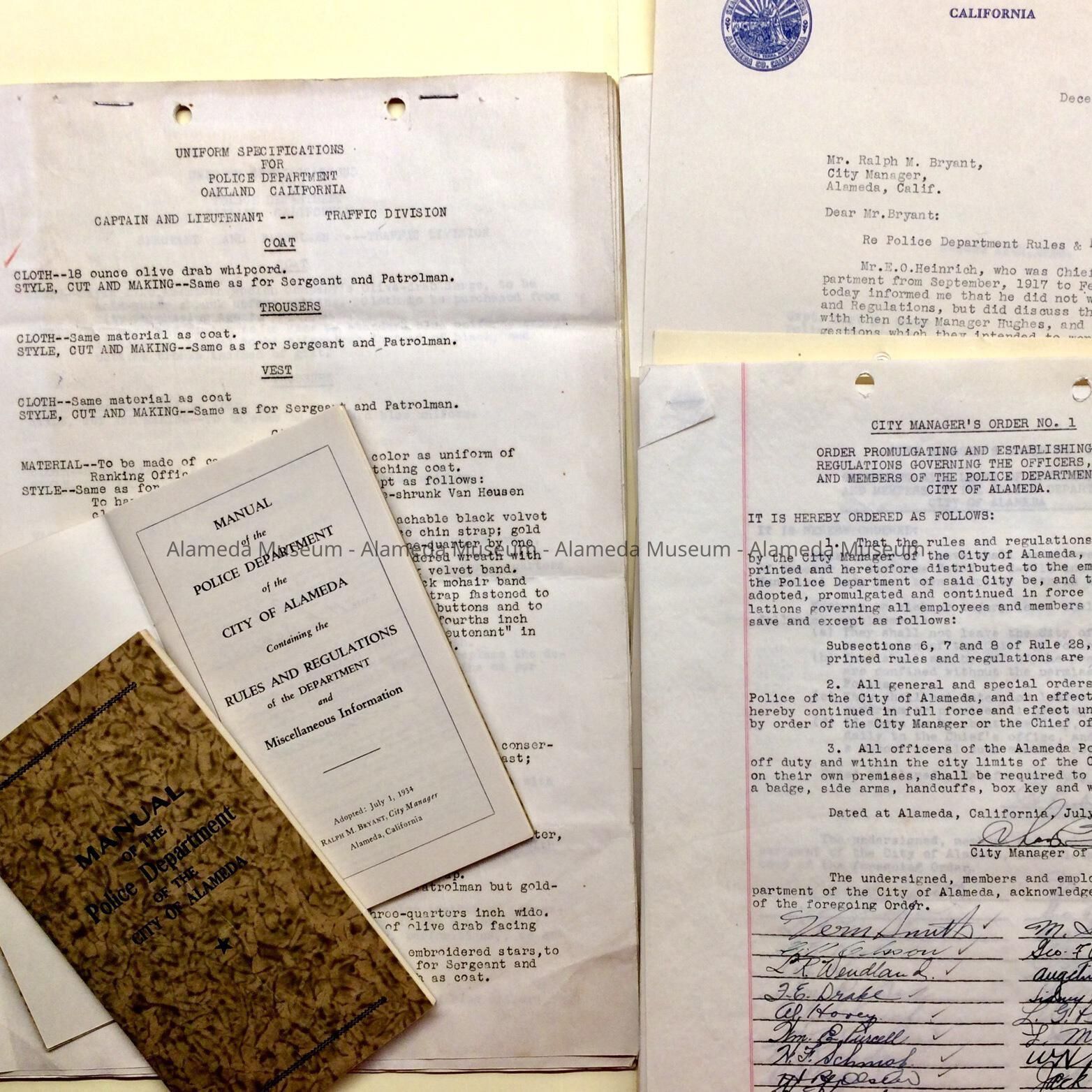 Acid-free legal size file folder with documents, including booklets stating, ‘Manual of the Police Department of the City of Alameda’, on the fly leaf, it states ‘Adopted: July 1, 1934, Ralph M. Bryant, City Manager’.