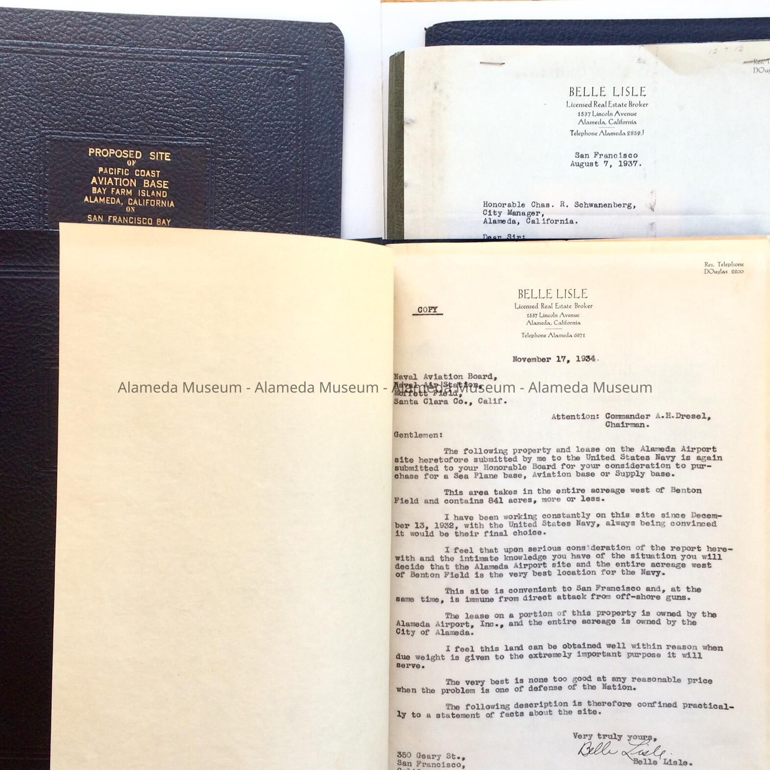 History of Object: Presentation folders prepared by Belle Lisle, Real Estate Broker, residence in San Francisco, office 1537 Lincoln Ave, promoting Alameda sites for a Pacific Coast military base. Folders include details about the location, about Alameda transportation, climate, and maps, and A-C include a flyer for the Port of Oakland.