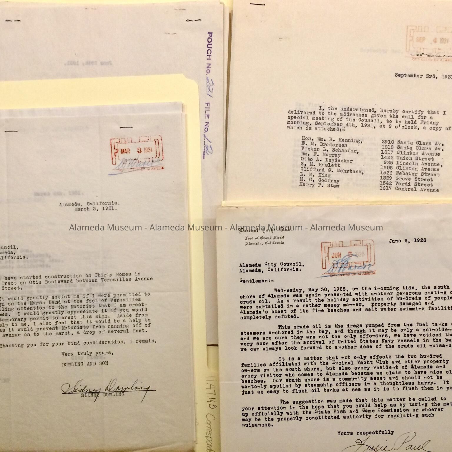 C. miscellaneous correspondence to City, including a complaint, on stationery, by the Encinal Yacht Club about crude oil ending up on the beaches, suspecting Navy vessels (#222, 1928), and complaints about the gong at Mastick Tower (#227, 1928)