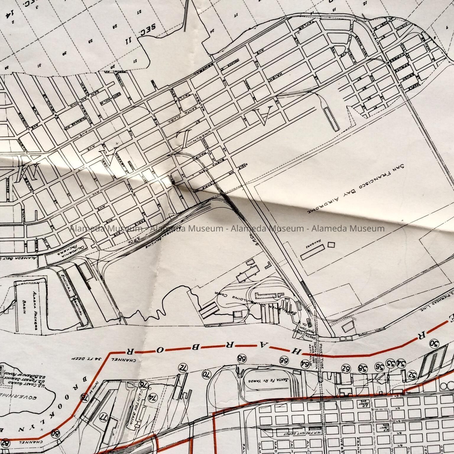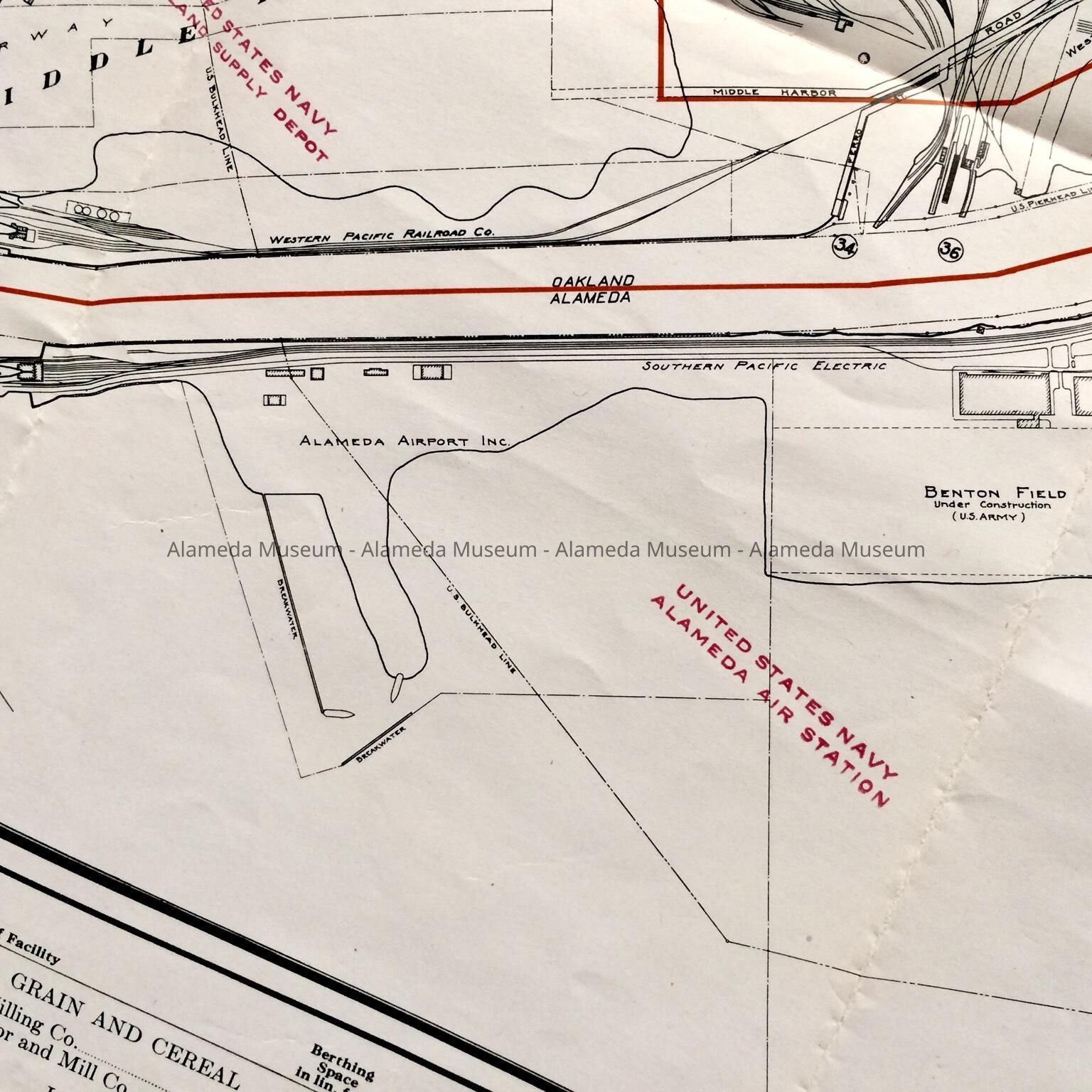 History of Object: Map of Oakland Harbor, compiled and published by the Board of Port Commissioners, Port of Oakland. Identifies area of jurisdiction of the Port of Oakland, including the Oakland Municipal Airport, and identifying businesses on the Oakland side of the Estuary, Also shows location of railway lines, piers, and some businesses on the Alameda side.