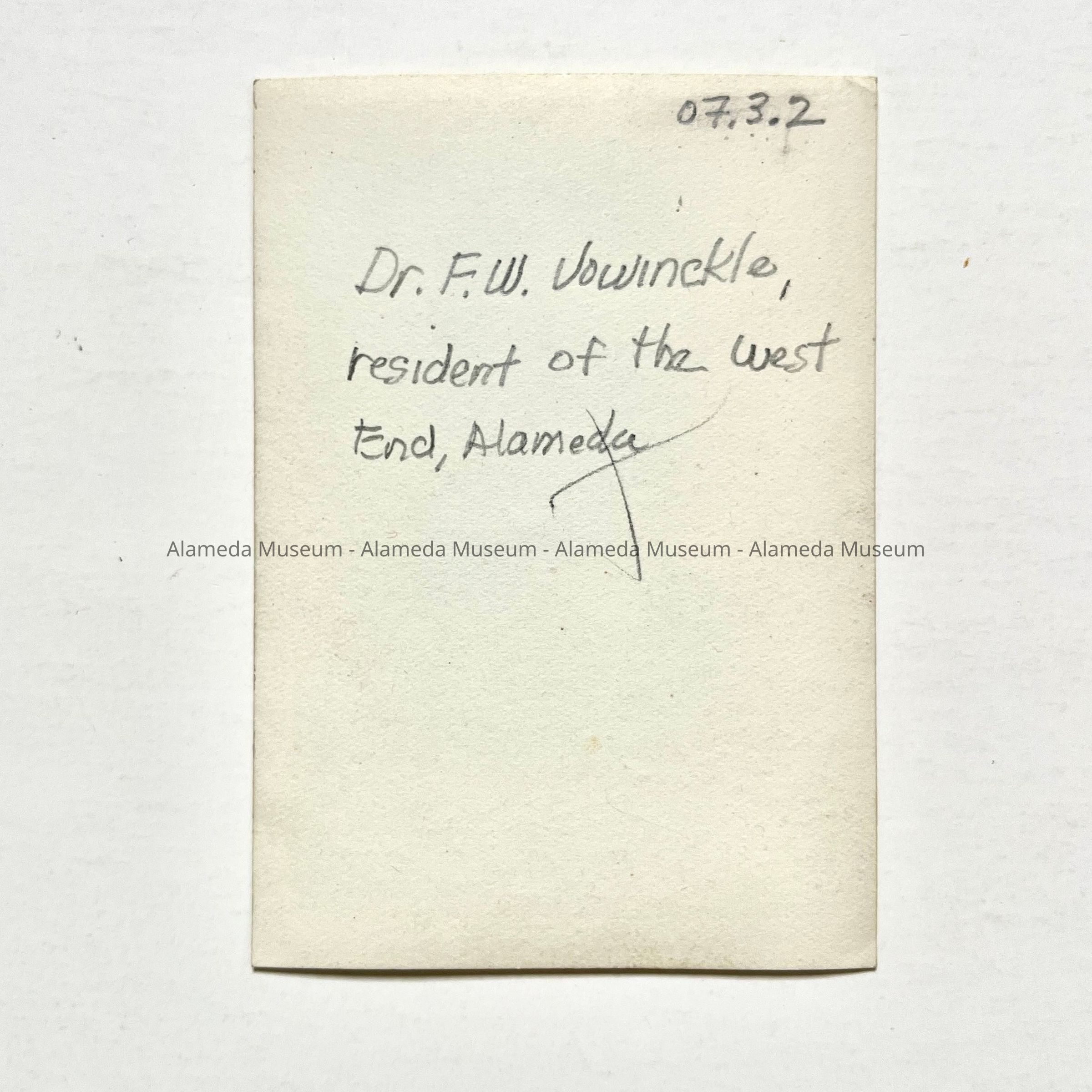 HISTORY OF OBJECT: A FORMAL PHOTOGRAPH OF DR. F. W. VOWINCKLE, WHO RESIDED AT 325 PACIFIC AVENUE, ALAMEDA.