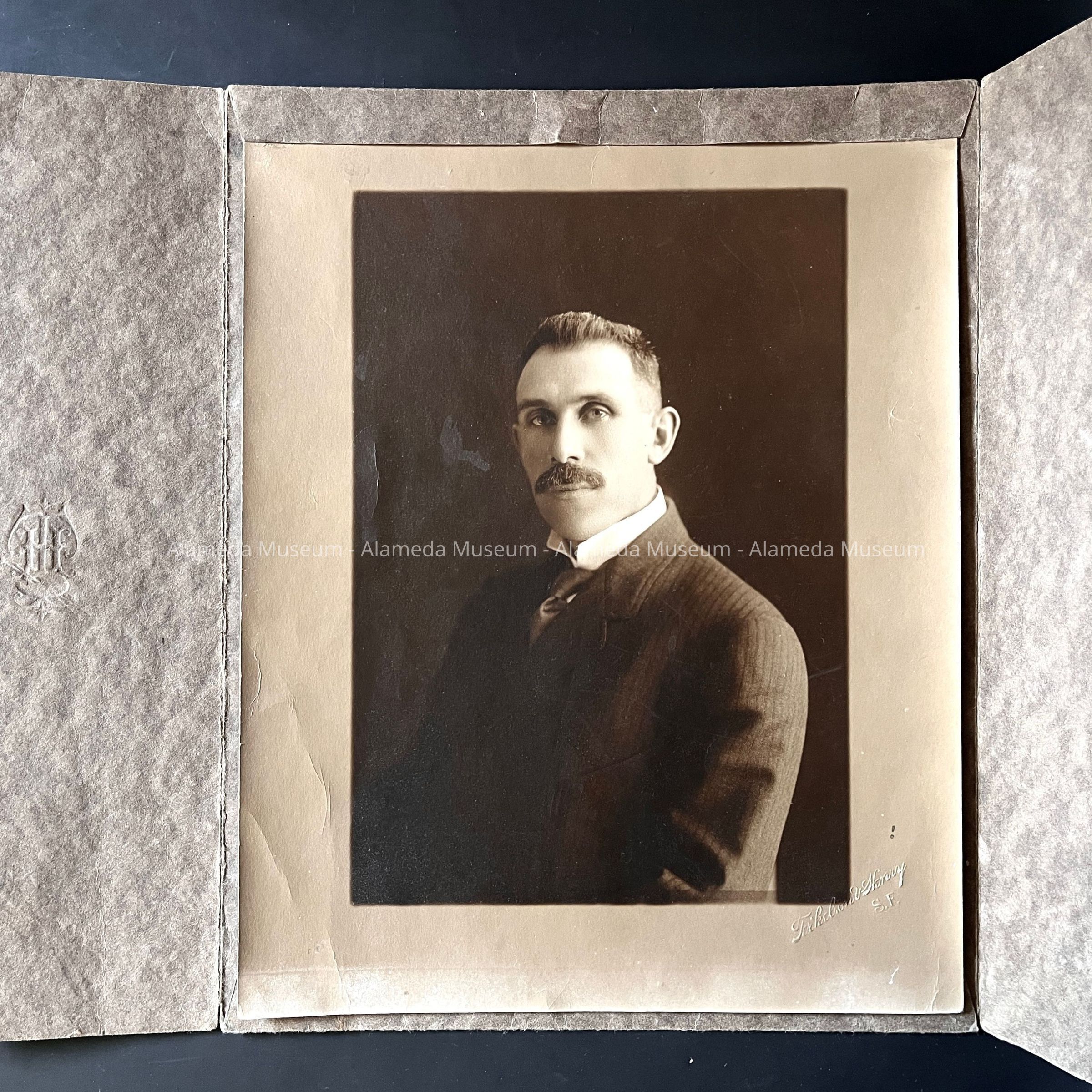 Description: A dark sepia-tinted image mounted in a studio folder. The photo and the jacket are signed: "Terkelson V. Henry, San Francisco".