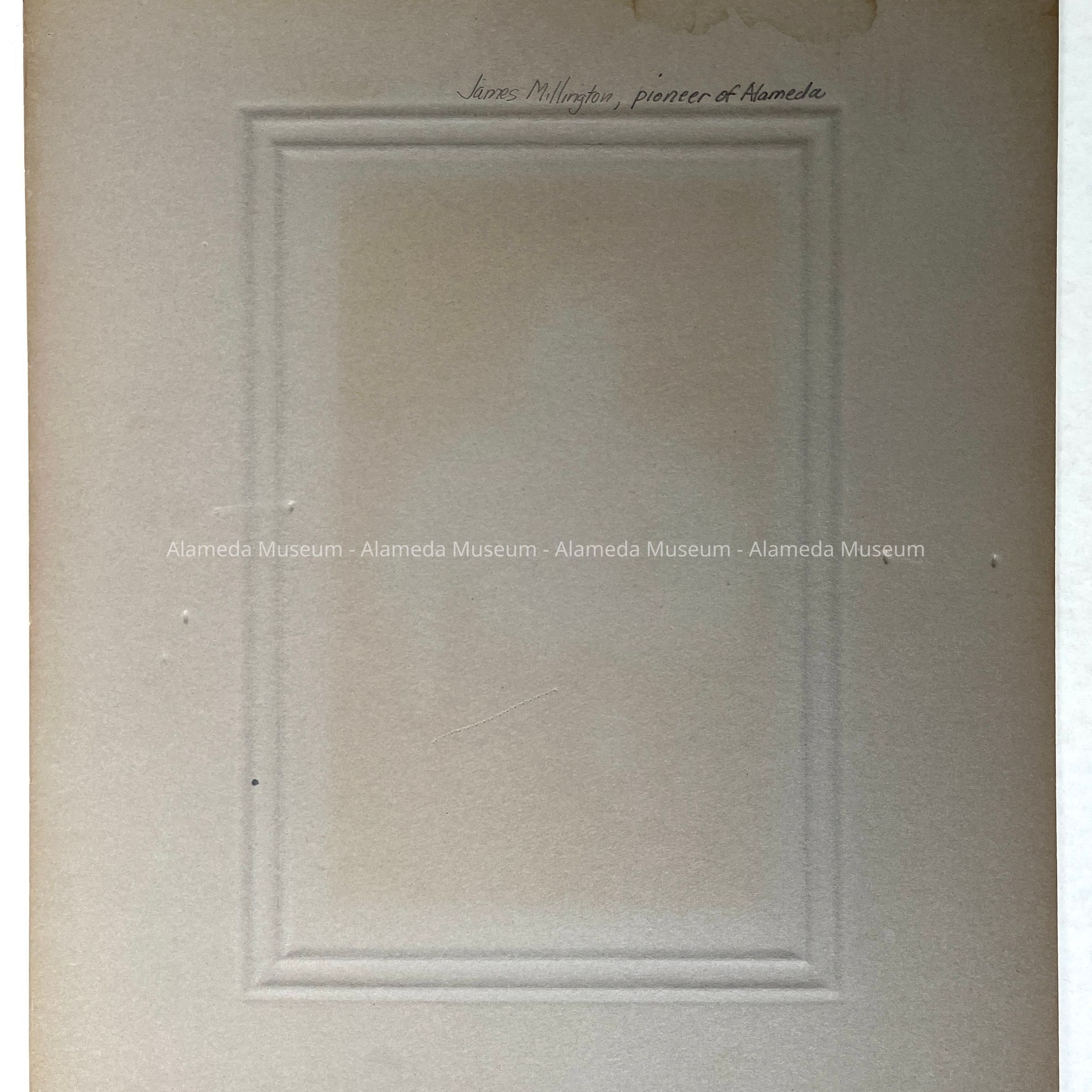 History of Object: Formal portrait of James Millington, pioneer of Alameda and former City Clerk. He died in Stockton, CA., in 1906 while visiting his daughter.