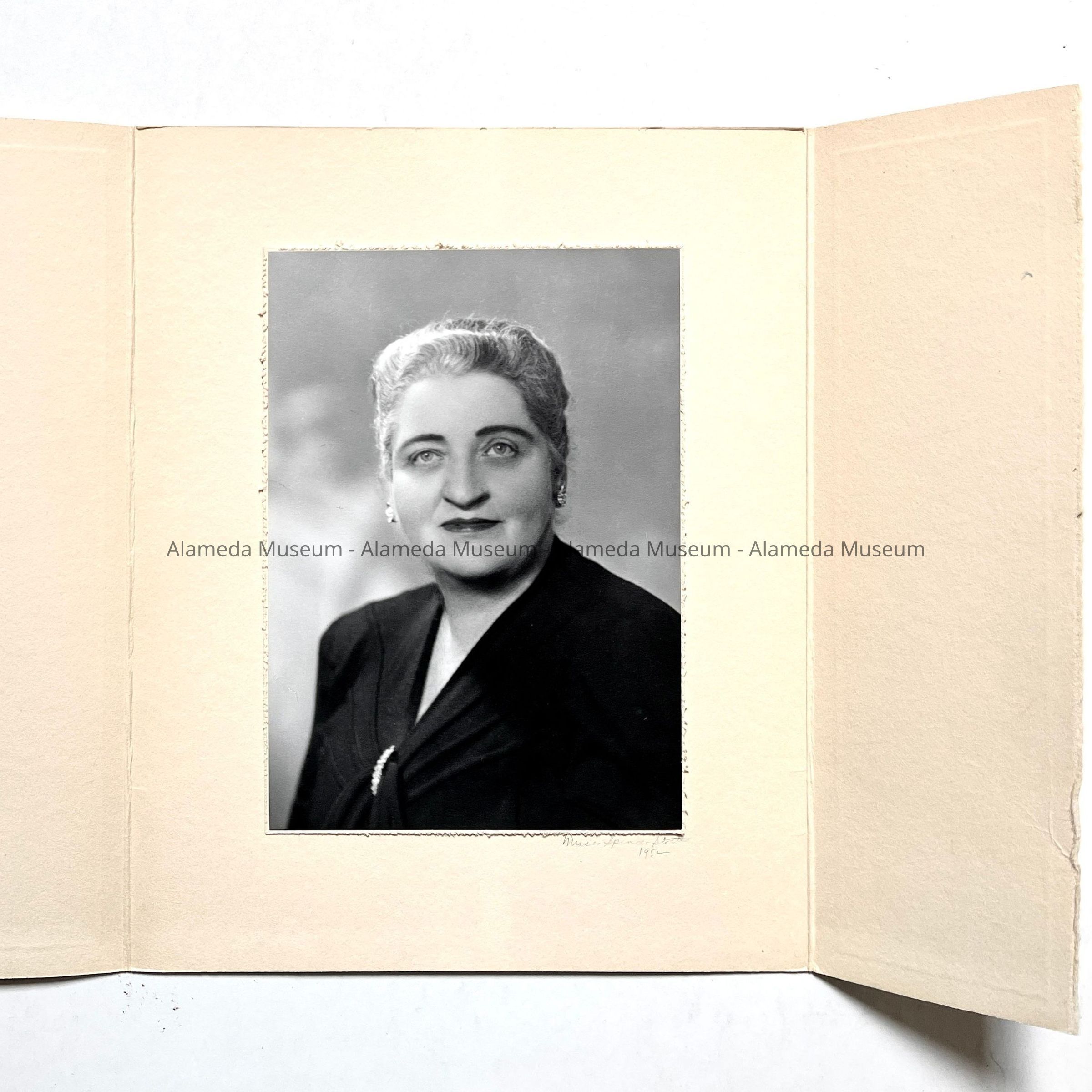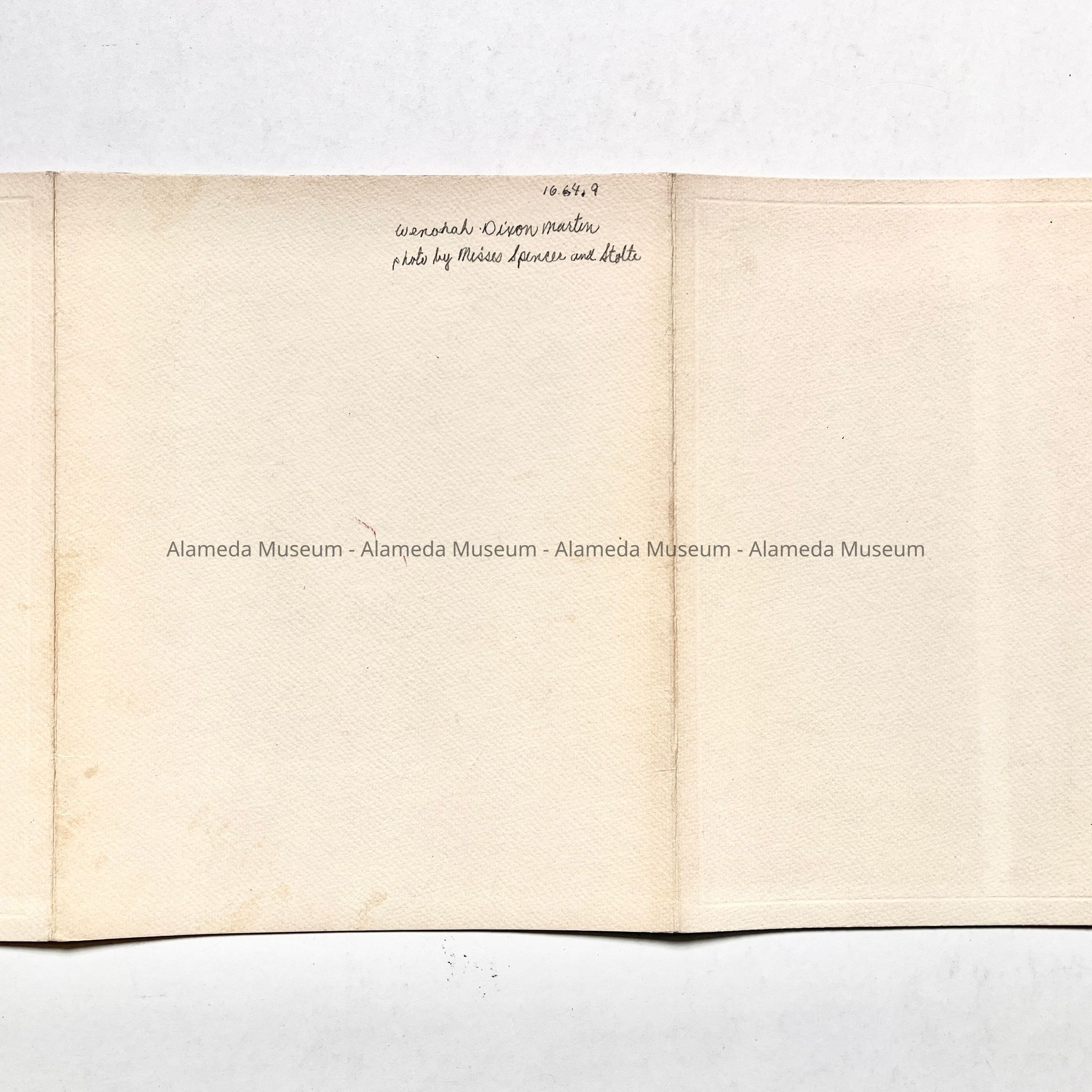 Description: A black and white head and shoulders studio portrait of Wenonah Martin. Photographers were Misses Spencer & Stolte, Alameda. The image is enclosed in a buff-colored studio folder. Below the image is the pencilled signature of the studio.