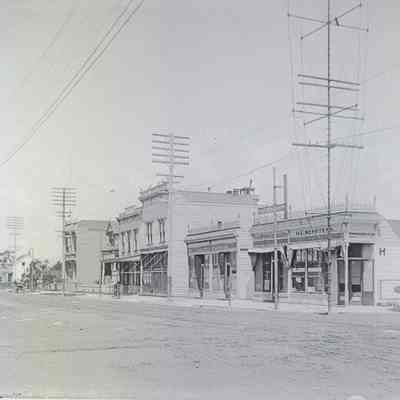 2024.75.1C is a glass plate negative, taken from the southwest corner of Lincoln and Webster, showing showing a commercial building on the northeast corner and additional commercial buildings to the north it, on the same side of Webster St. A light tower is next to the corner building and a windmill and water tower can be seen behind it. Though greatly altered, several of the commercial buildings still exist. The top right corner has broken off and there are a couple of worn areas along the bottom edge. Otherwise, this negative is in very good condition.