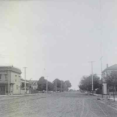 2024.75.1B is a glass plate negative, taken from the middle of the intersection of Lincoln and Webster, looking west and showing both sides of Lincoln Ave. A commercial building on the northeast corner, an adjacent light tower and several houses on both sides of Lincoln Ave. are shown The building and some of the houses on both sides still exist. This negative is in excellent condition, with some tape on the back of the right side of the bottom edge.