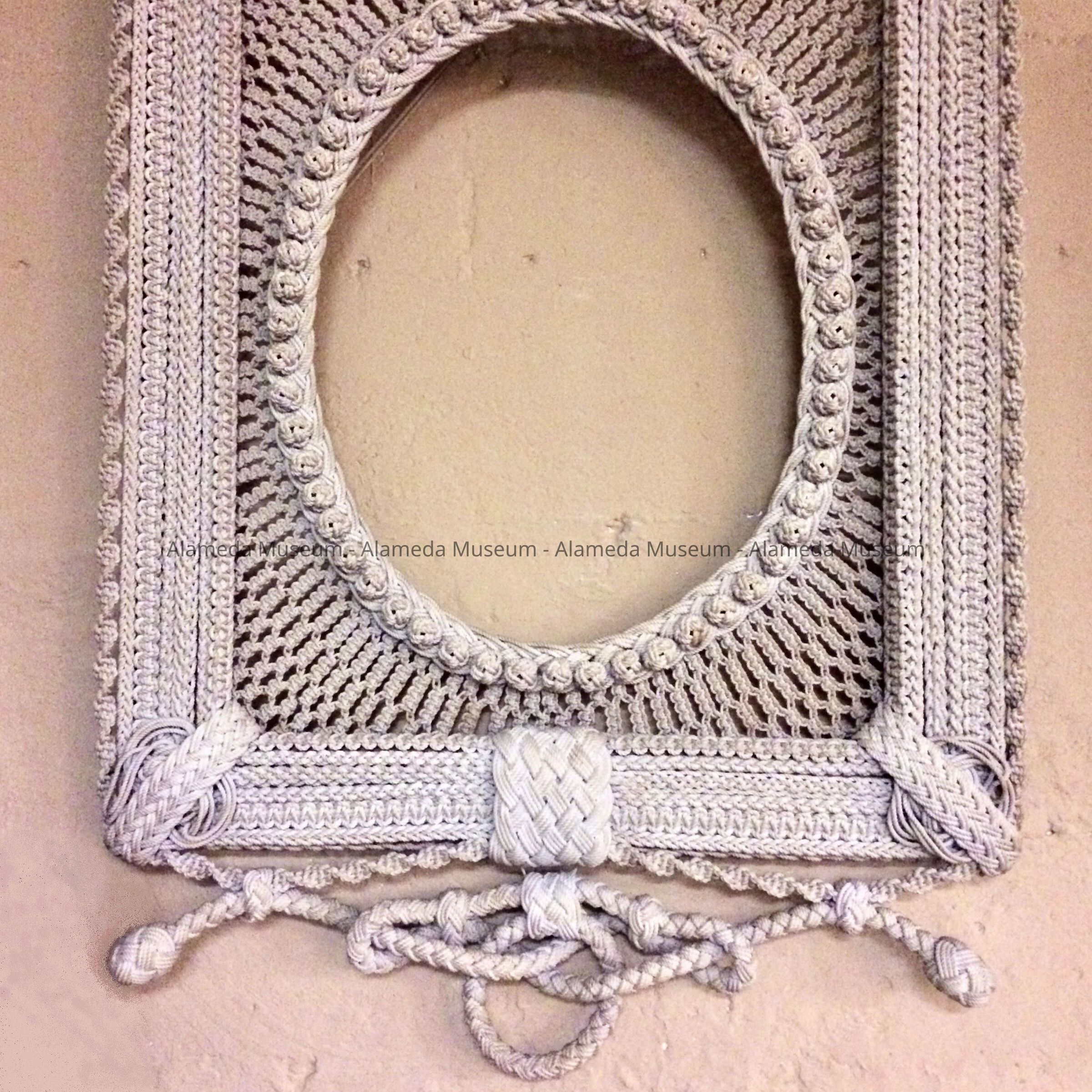 HISTORY OF OBJECT: A FRAME CREATED BY WILLIAM EBERT, MASTER MARINER OF 1517 FIFTH STREET, ALAMEDA. AT ONE TIME MR. EBERT WAS FIRST MATE FOR THE PACIFIC COAST STEAMSHIP COMPANY. HE DIED ABOARD THE SHIP IN EITHER 1913 OR 1914. HE HAD MARRIED HENRIETTA DENKE, WIDOW OF A R DENKE, BUILDER. ACCORDING TO FAMILY HISTORY, 1517 FIFTH STREET WAS BUILT BY A. R. DENKE. THE FRAME, WHICH ORIGINALLY CONTAINED A PORTRAIT OF CAPT. WM EBERT, HUNG IN THE DINING ROOM OF THEIR HOME. THE FRAME WAS DONATED BY GORDON EBERT WHO IS 96 YEARS OLD AND WAS BORN IN THE FIFTH STREET HOME. HE WAS SON OF WILLIAM AND FATHER OF THE DONOR. GORDON'S DAUGHTER BROUGHT THE FRAME TO THE ALAMEDA MUSEUM.