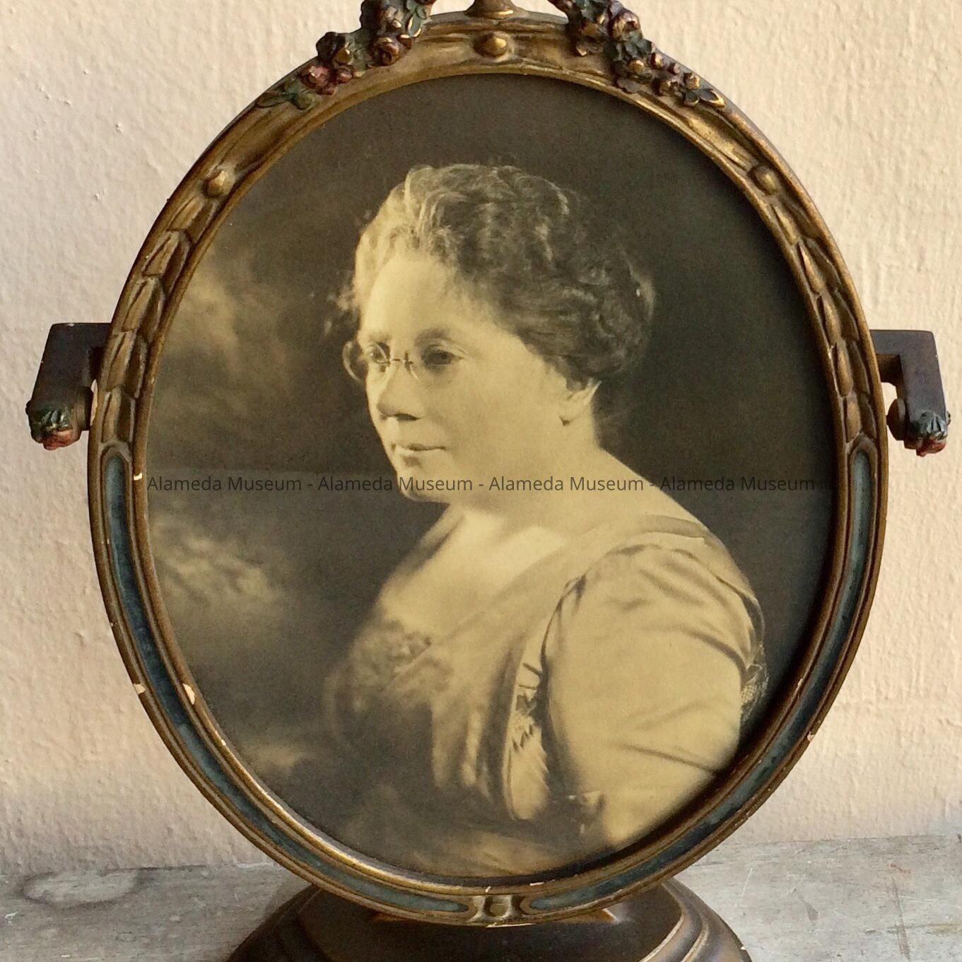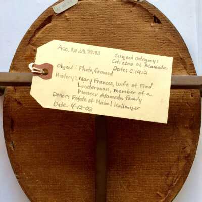 FRAMED PHOTO OF MARY FRANCES, WIFE OF FRED LINDERMAN AND MOTHER OF MABEL KOLLMYER. SHE WAS A MEMBER OF A PIONEER ALAMEDA FAMILY AND DAUGHTER OF ABEL THORNTON WHO OWNED AND FARMED AT WHAT IS NOW KNOWN AS LIBERTY AVENUE.