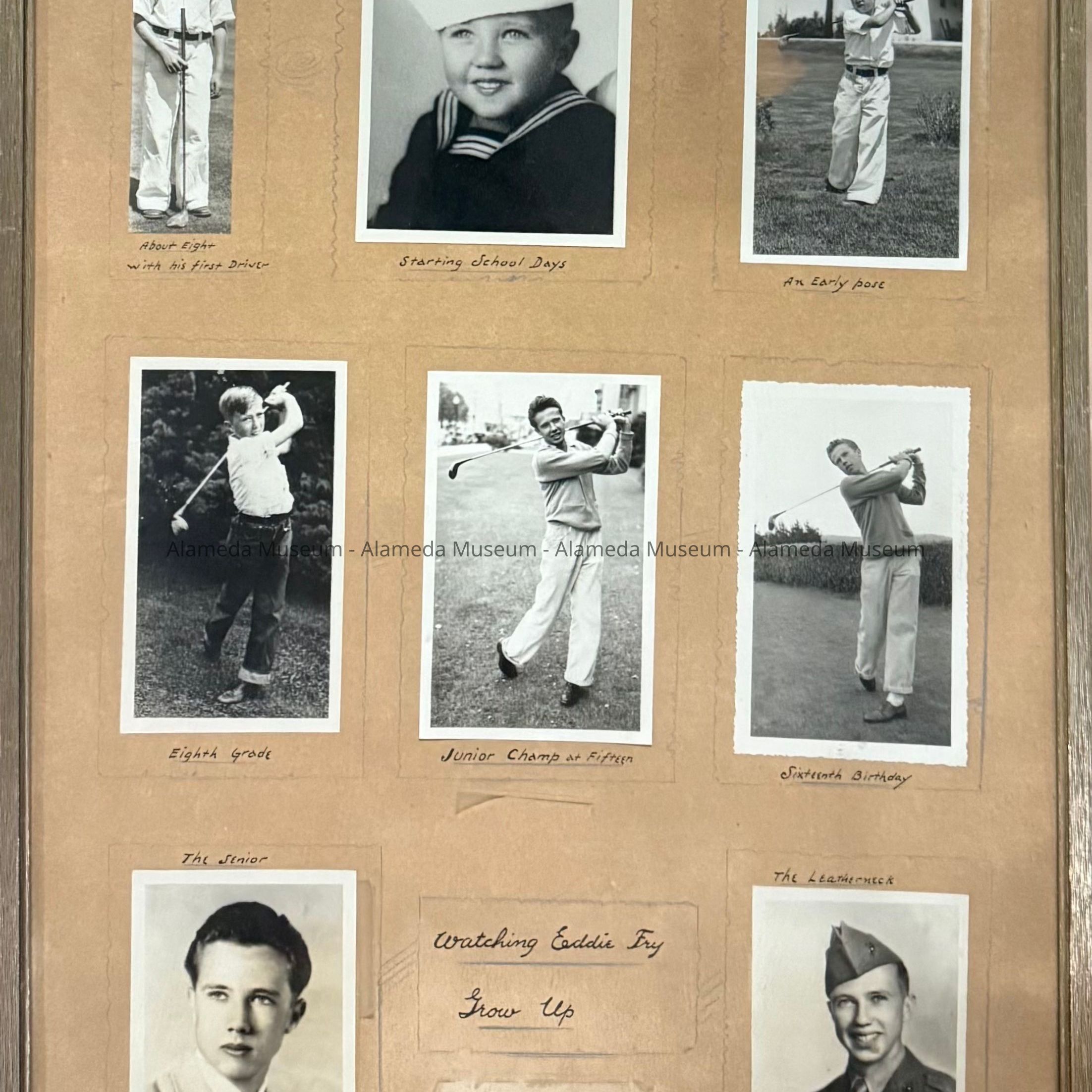 PHOTOS OF THE LATE SON OF EARL FRY, GOLF PRO, ALAMEDA MUNICIPAL GOLF COURSE. THE PHOTOS DEPICT EARL ( EDDIE) FRY AT VARIOUS AGES, AS WELL AS A FORMAL PHOTOGRAPH OF EDDIE IN HIS US MARINE CORPS UNIFORM. HE WAS A CHAMPION GOLFER IN HIS OWN RIGHT.