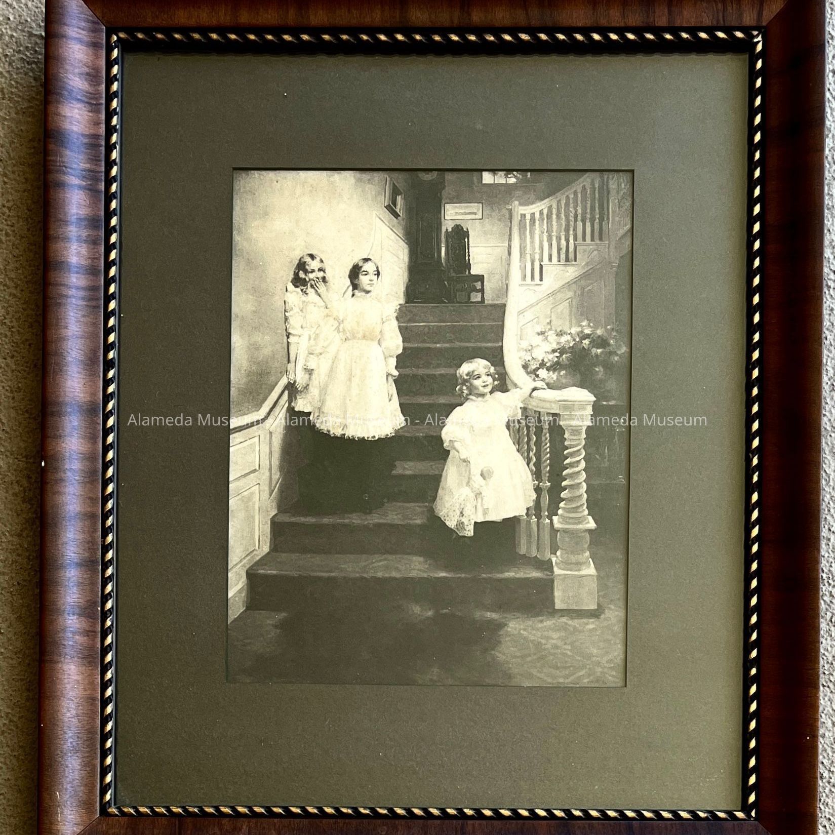 HISTORY OF OBJECT: FRAMED ART PRINT DEPICTING CHILDREN IN PERIOD DRESS ON A STAIRCASE. THE FRAMED PRINT HUNG IN THE LINDERMAN-KOLLMYER HOME AT 2001 ALAMEDA AVENUE FOR MANY YEARS.
