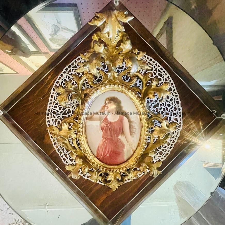 Hand-painted German-made plaque in carved wood and gesso frame. It originally belonged to Mr. and Mrs. Albert Stagnaro. Mr. Stagnaro had an art glass business on Webster Street, Alameda.