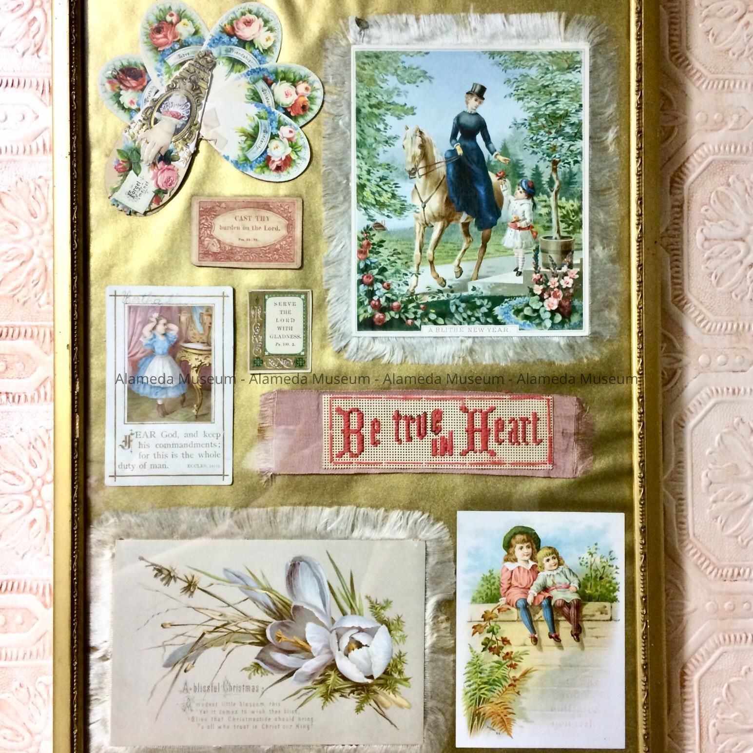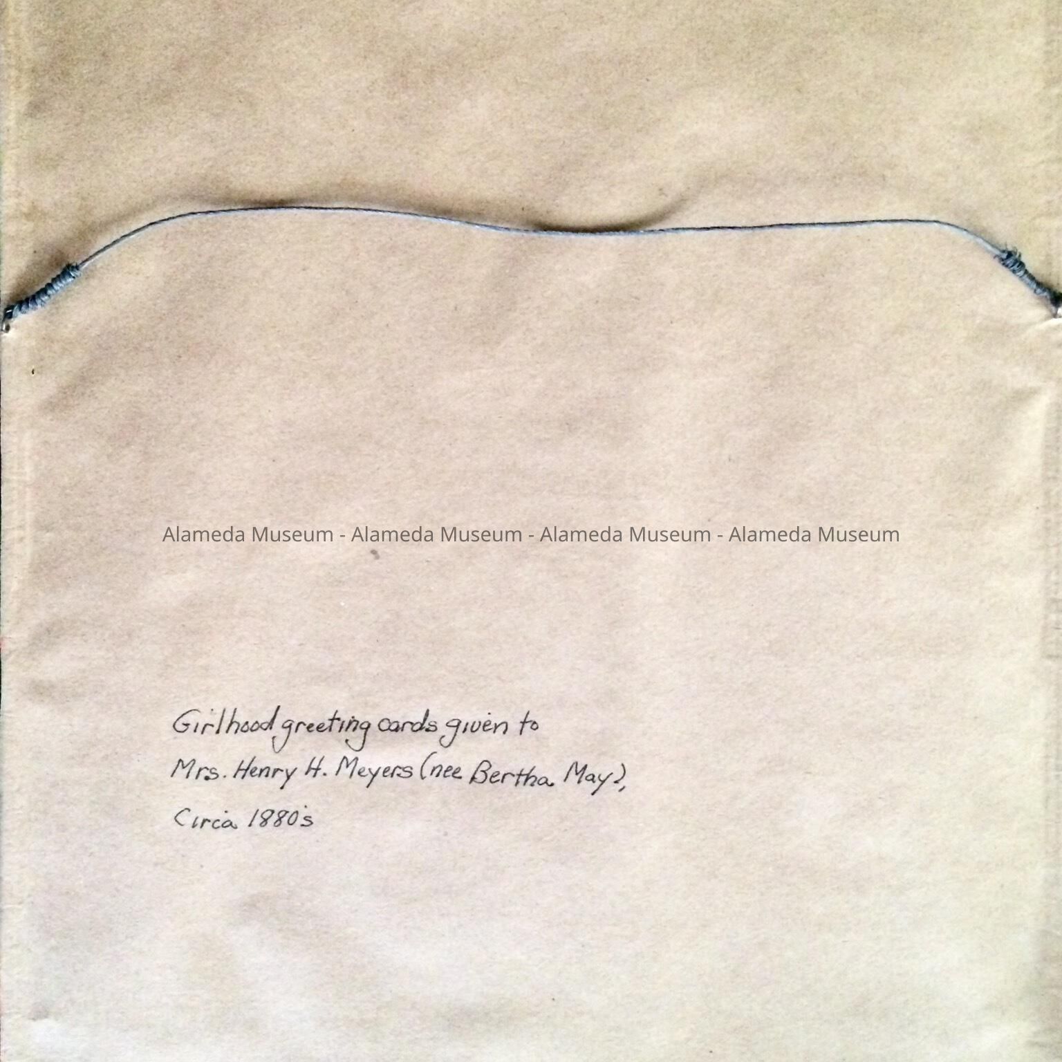 Collection of framed greeting cards given to Bertha May (native of Alvarado, Cal.), subsequent to her marriage in 1894 to Henry H. Meyers. The cards were framed by her daughter, Jeanette. The cards have been housed in the family residence (2021 Alameda Avenue) since 1897.
