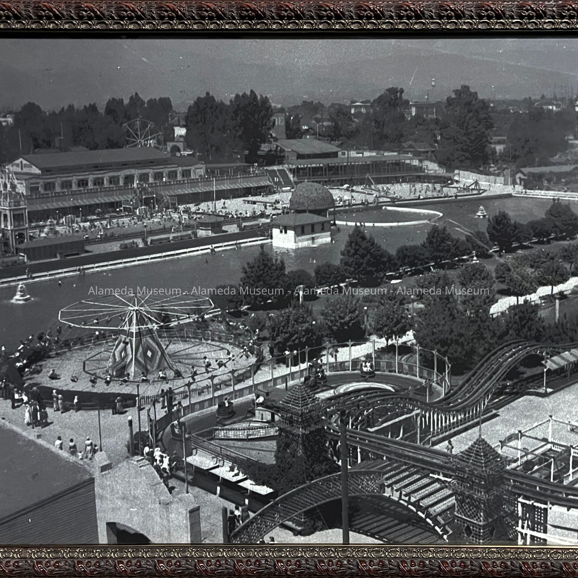 Description: black and white enlargement of a photograph, framed in wood frame with gesso decorations, an outer strip painted in mahogany and a narrower inside strip painted bronze. Black backing paper. Image shows a wooden roller coaster, swing-merry-go-round, and another ride in the foreground, with a large pool and beyond that, buildings and a ferris weel in the background.