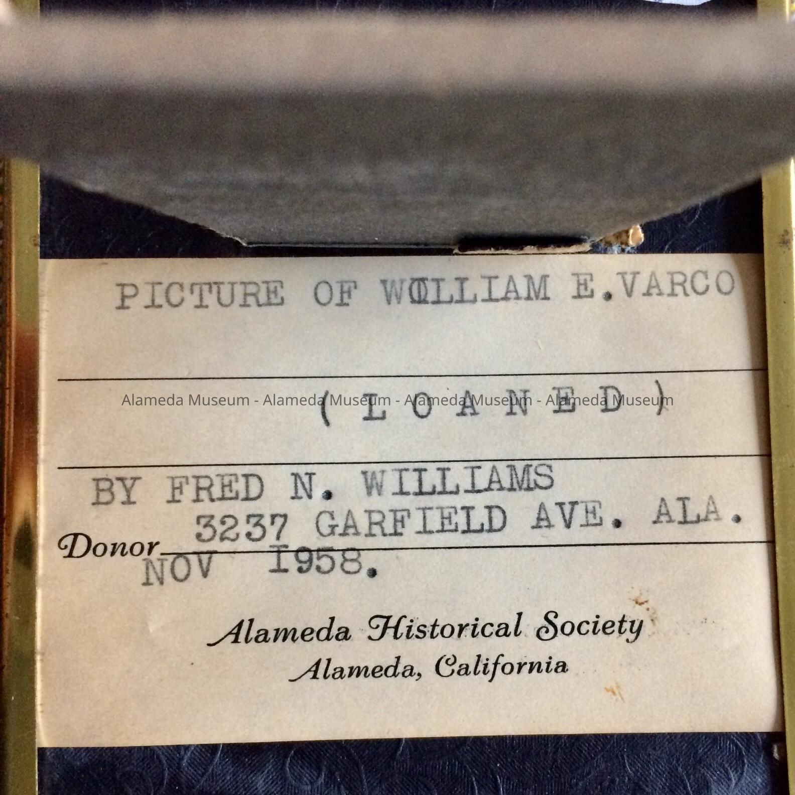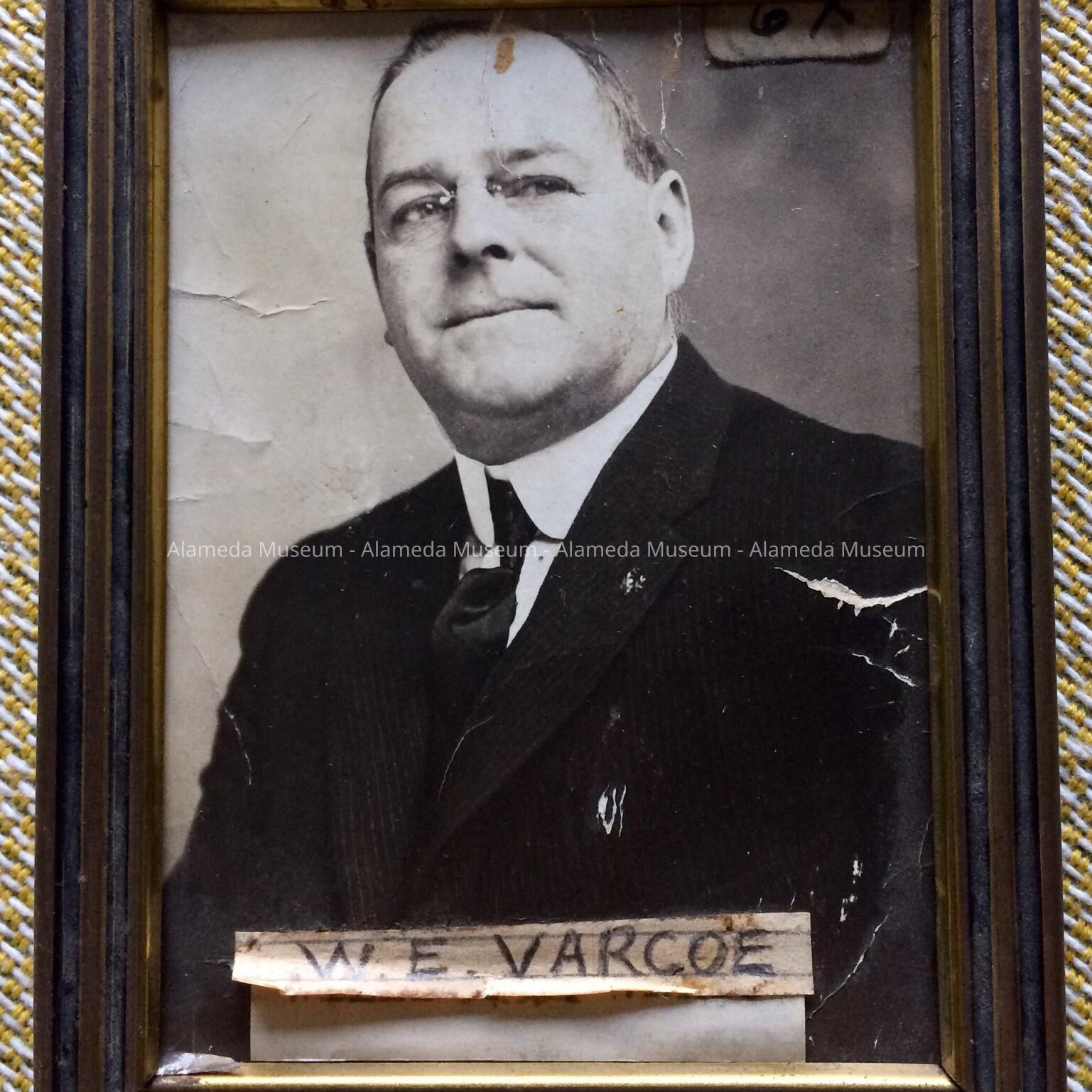 A FORMAL PHOTOGRAPH OF WILLIAM E VARCONE, SALESMAN, WHO LIVED AT 1701 BROADWAY, ALAMEDA, AS LISTED IN THE 1912 CITY DIRECTORY. HE WAS A LONGTIME RESIDENT OF THE COMMUNITY. THE OBJECT WAS DONATED IN 1958 AND NOT CATALOGED UNTIL THIS DATE.