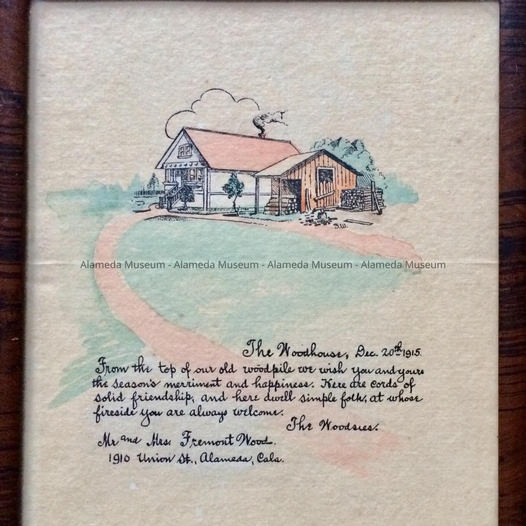 History of Object: A greeting card, framed, sent to friends by Mr. and Mrs. Fremont Wood of 1919 Union St., Alameda. Fremont Wood (1860-1937) was an artist by avocation, apparently self-taught. Professionally, he was the Secretary of the Citizens Building & Loan Assn., but his art work dealt with scenes of Chinatown, Spanish missions, and landscapes.