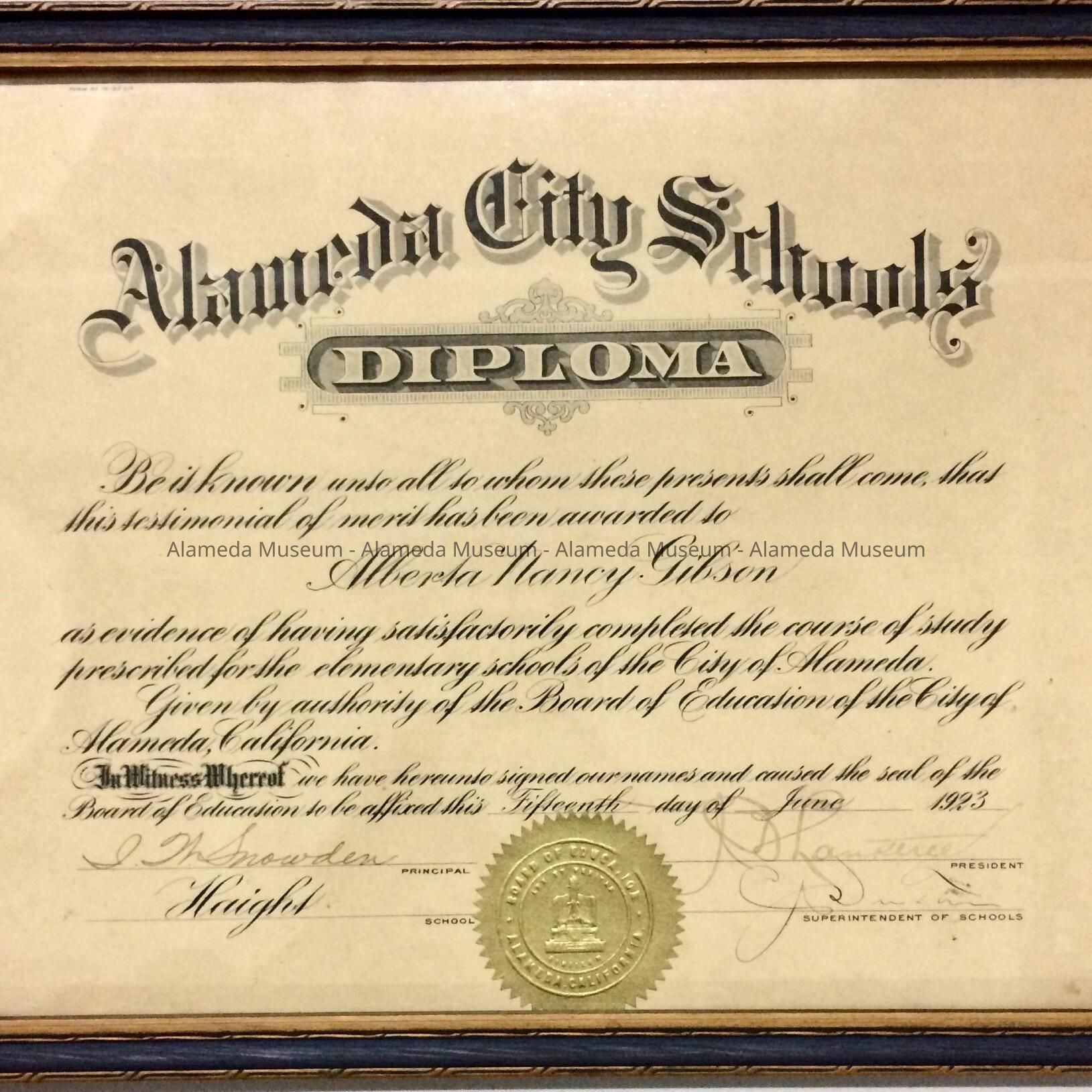Description: Printed diploma form with bold caption stating Alameda City Schools.