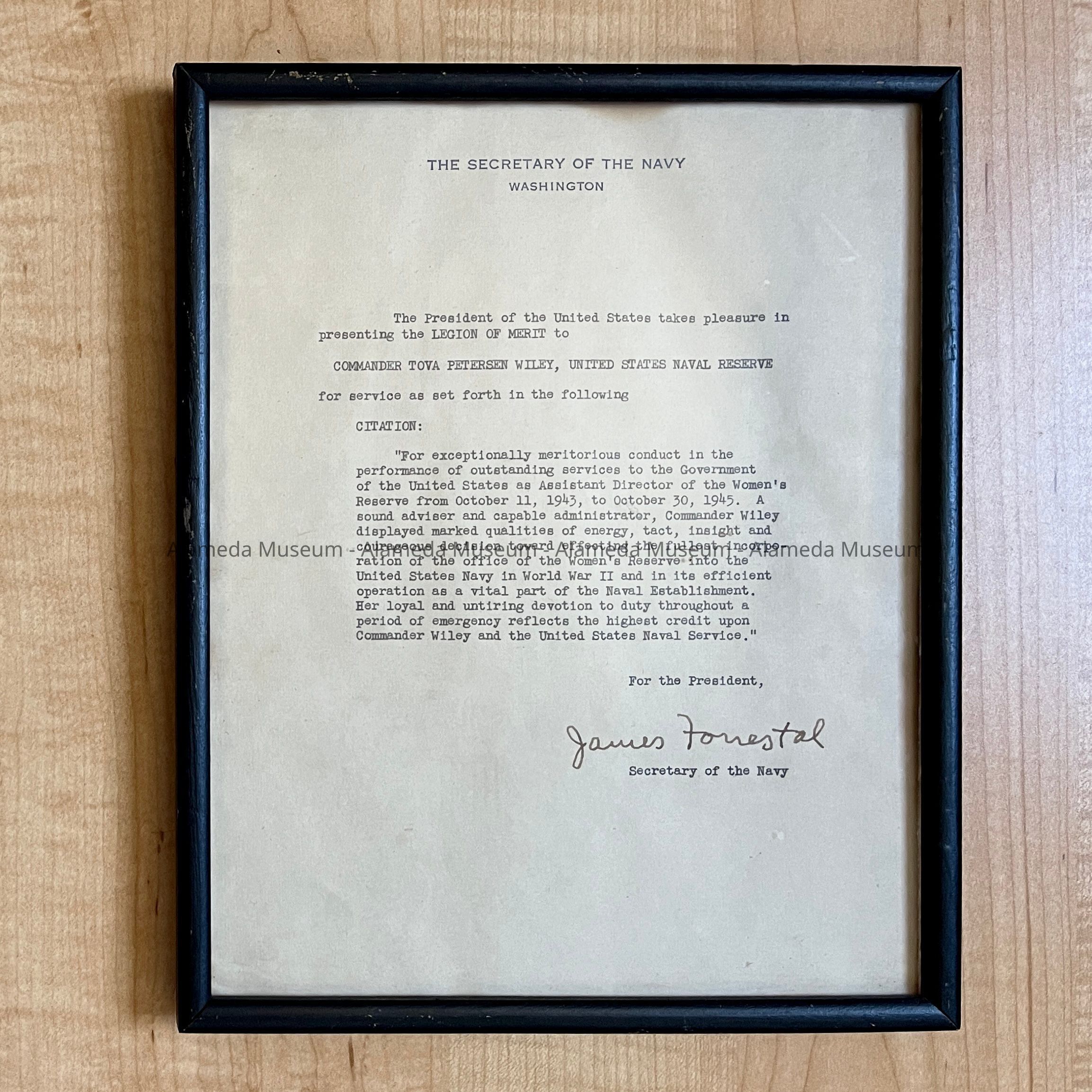 History of Object: A LETTER OF COMMENDATION TO CDR. TOVA P. WILEY, USNR, COMMENDING HER FOR HER SERVICE AS ASSISTANT DIRECTOR OF THE WOMEN'S RESERVE FROM OCTOBER 11, 1943 TO OCTOBER 30, 1945. LETTER WAS SIGNED BY JAMES FORRESTAL, SECRETARY OF THE NAVY.
