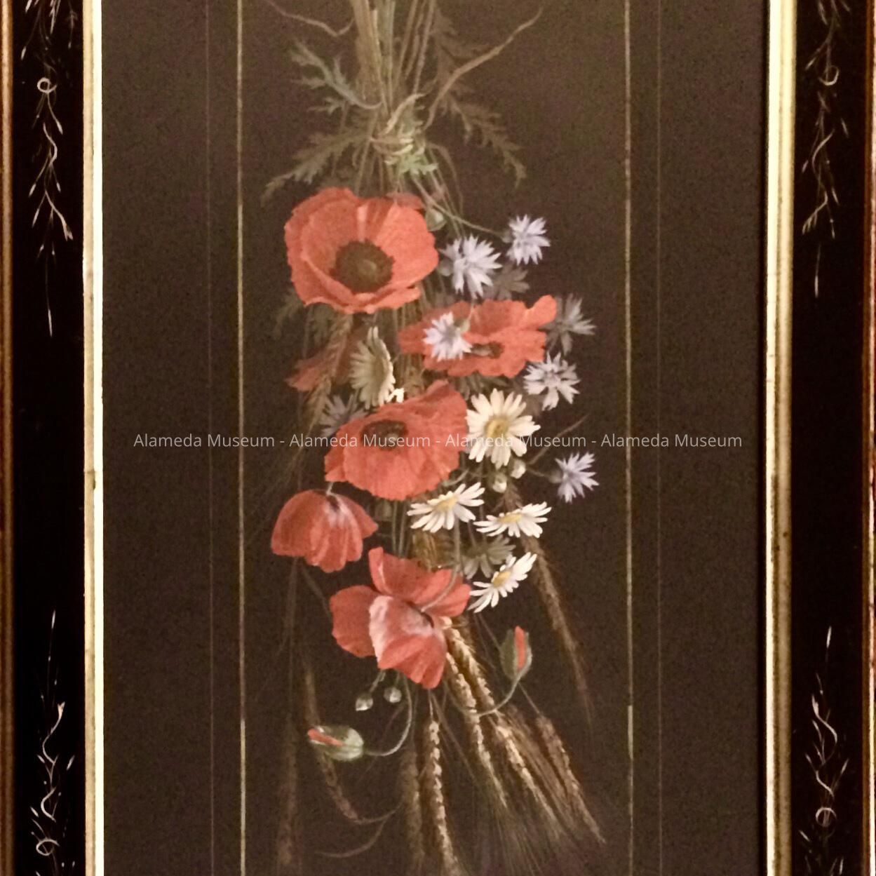 Description: Two colored chromolithographs with original mats and frames. The frames are ebonized gesso with various designs on a black background trimmed in gold leaf. Lithograph "A" has a floral design with birds and is signed, "Ellen Robbins"; Lithograph "B" has a poppies and daisies design and was printed by Louis Prang.