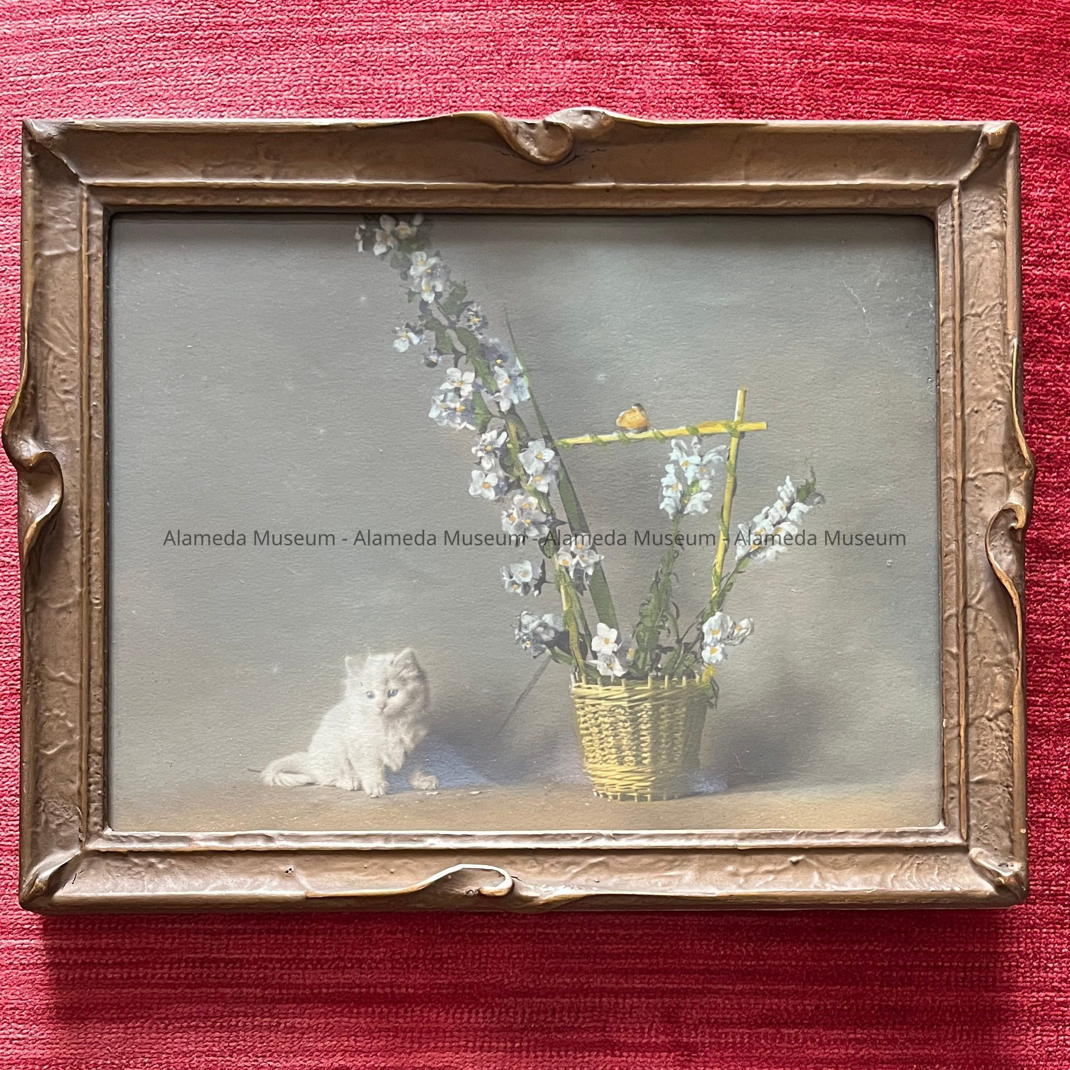 Framed photo of a kitten and basket of flowers, c. 1920Entry/Object ID