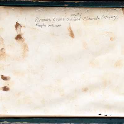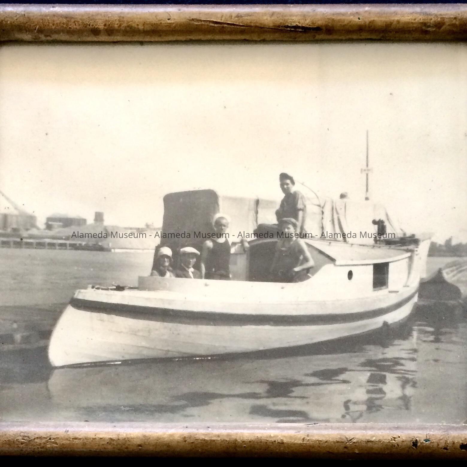 History of Object: A photo of a pleasure craft with a wooden hull and passengers consisting of four men and one woman. The vessel appears to be unnamed and unnumbered. Image taken in the Alameda/Oakland Estuary. Visible in the distance are cranes and buildings on the north Oakland side of the estuary.
