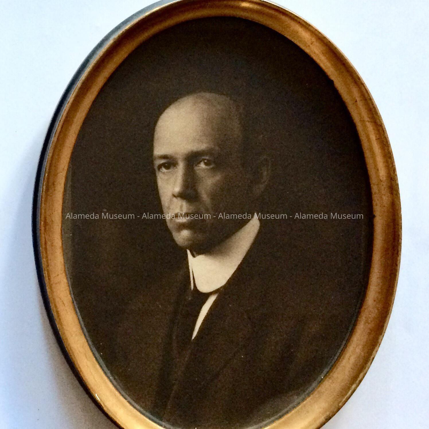 DESCRIPTION: SEPIA-TINTED PHOTOGRAPH UNDER GLASS IN AN OVAL-SHAPED GOLD LEAF AND EBONIZED FRAME. ON THE REVERSE SIDE OF THE FRAME IS THE ORIGINAL PAPER LABEL STATING, "PIATT'S, ALAMEDA, CAL," IN BLACK-AND-GOLD COLORED TYPE.