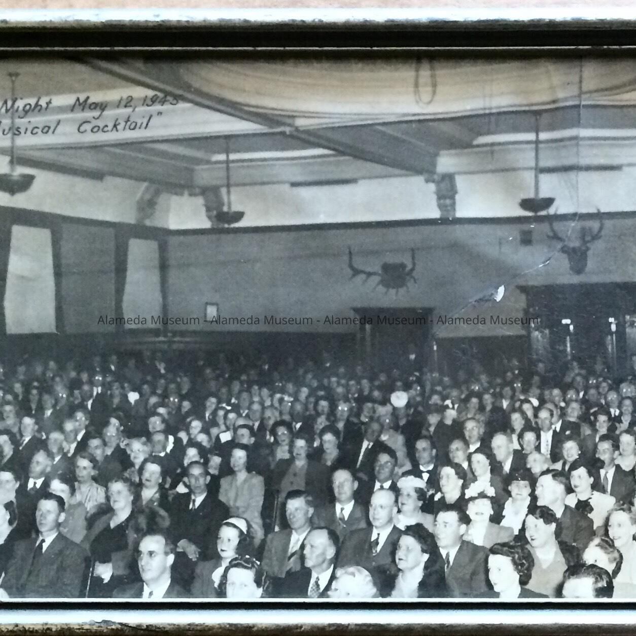 HISTORY OF OBJECT: PHOTOGRAPH TAKEN OF AUDIENCE ATTENDING MUSICAL PROGRAM PERFORMED BY THE SAVOY LIGHT OPERA COMPANY, OF SAN FRANCISCO. AT THE ELKS CLUB, MAY 12, 1945. THE PHOTOGRAPH WAS DONATED TO THE HISTORICAL SOCIETY BY THE DAUGHTER OF "STICKY BILL" MAYNARD, ONE OF THE COMMITTEE MEMBERS WHO PUT ON THE SHOW.