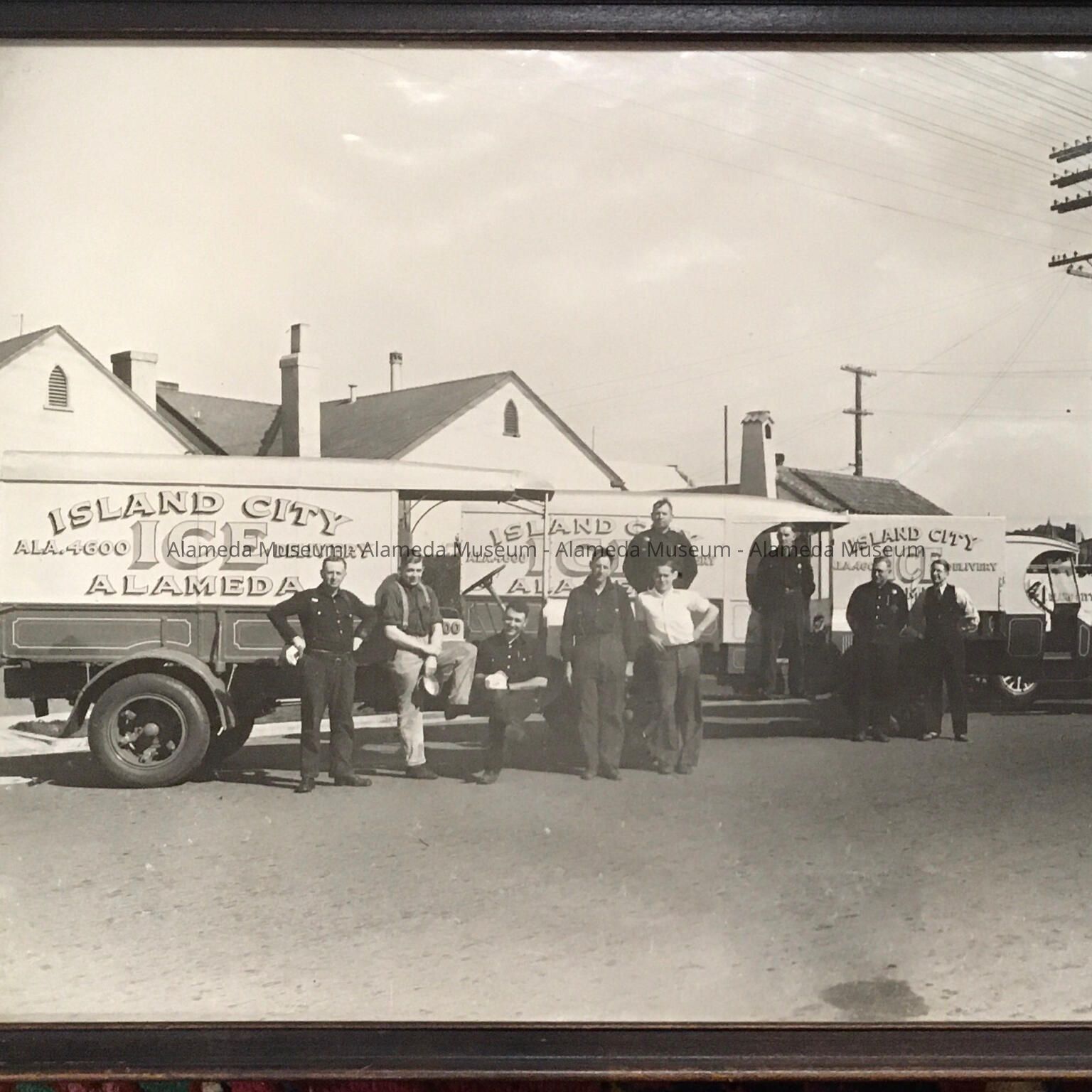 PHOTOGRAPH OF AN ASSEMBLAGE OF THE ISLAND CITY ICE COMPANY'S TRUCKS, VEHICLES, AND EMPLOYEES.