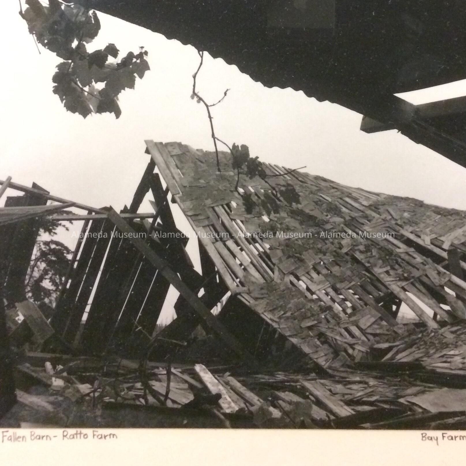 History: Photograph depicting fallen barn on Ratto farm, Bay Farm Island.