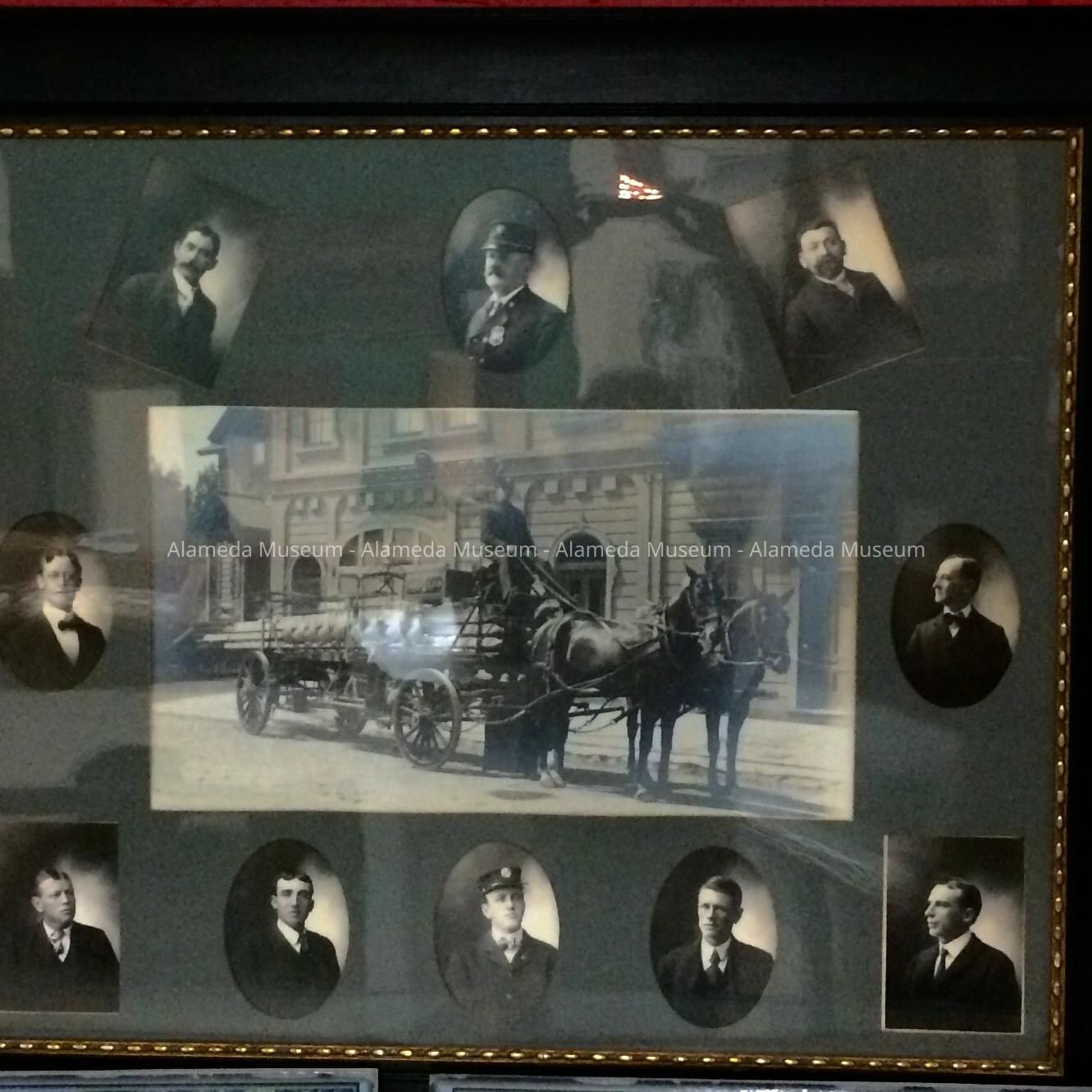 Framed photos of Hook & Ladder wagon (horse drawn), of Truck #1, Alameda Fire Dept., Webb Avenue, Chief Fred Krauth, and members of the Company, circa 1902-03.