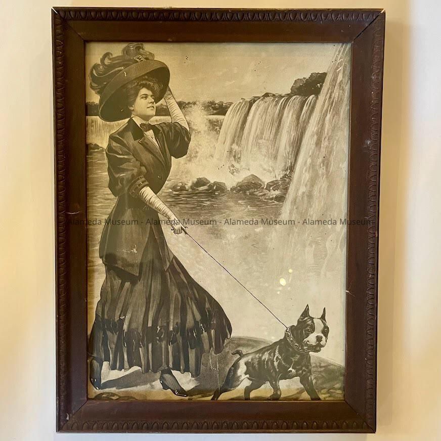 Framed print of a lady walking a dog at Niagara Falls, c. early 1900sEntry/Object ID