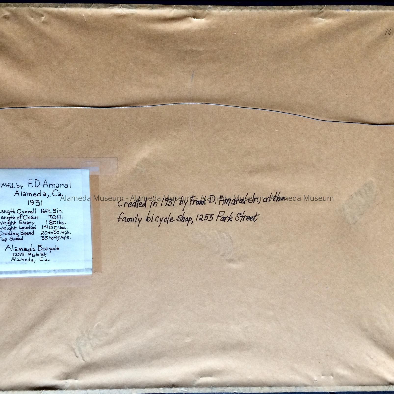 HISTORY OF OBJECT: THE VEHICLE HAS 6 SEATS AND WAS CREATED AND MANUFACTURED IN 1931 BY F.D. AMARAL, ALAMEDA, CALIFORNIA AT THEIR CYCLING SHOP AT 1255 PARK STREET, ALAMEDA, CA.